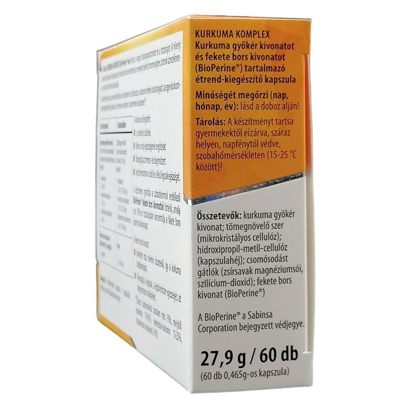 Összetevők: kurkuma gyökér kivonat; tömegnövelő szer (mikrokristályos cellulóz); hidroxipropil-metil-cellulóz (kapszulahéj); csomósodást gátlók (zsírsavak magnéziumsói, szilícium-dioxid); fekete bors kivonat (BioPerine)