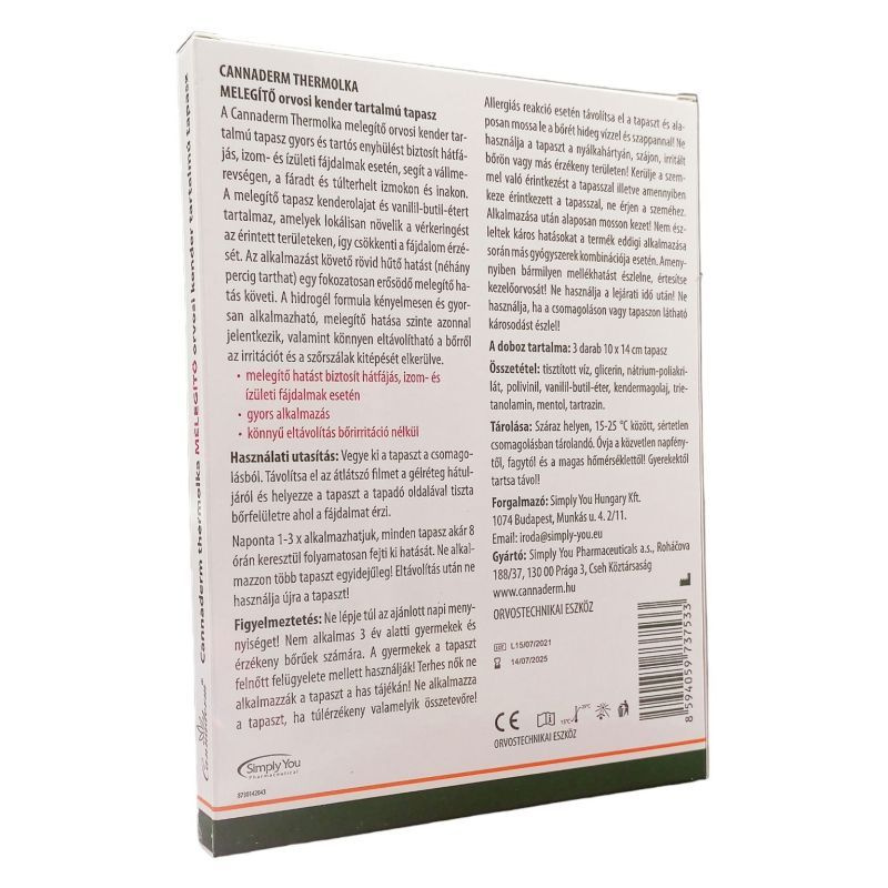 A Cannaderm Thermolka melegítő orvosi kender tartalmú tapasz gyors és tartós enyhülést hozhat hátfájás, izom- és ízületi fájdalmak esetén, segíthet a vállmerevségen, a fáradt és túlterhelt izmokon és inakon. A melegítő tapasz kenderolajat és mentolt tartalmaz, amelyek helyileg növelhetik a vérkeringést az érintett területeken, így csökkentheti a fájdalom érzését.