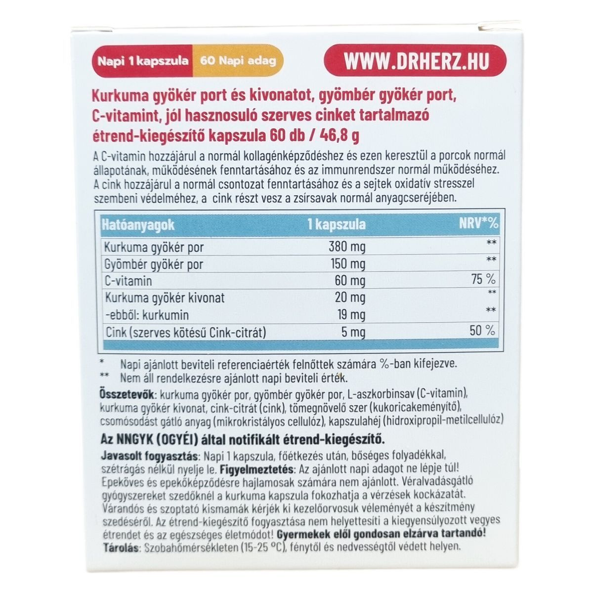 A Dr.Herz® Kurkuma 400 mg kapszula kurkuma gyökér port és kivonatot, gyömbér gyökér port, C-vitamint és jól hasznosuló szerves cinket tartalmaz. A C-vitamin hozzájárulhat a normál kollagénképződéshez, ezáltal támogathatja a porcok normál állapotának és működésének fenntartását, valamint az immunrendszer egészséges működését. A cink szerepet játszhat a normál csontozat fenntartásában, a sejtek oxidatív stresszel szembeni védelmében, valamint a zsírsavak normál anyagcseréjében. A termék természetes összetevőkkel készül, vegánok számára is megfelelő, és napi egyszeri adagként ajánlott. Nem ajánlott epeköveseknek vagy azoknak, akik epekőképződésre hajlamosak, továbbá véralvadásgátló szedése esetén orvosi tanács kérendő a fogyasztás előtt.