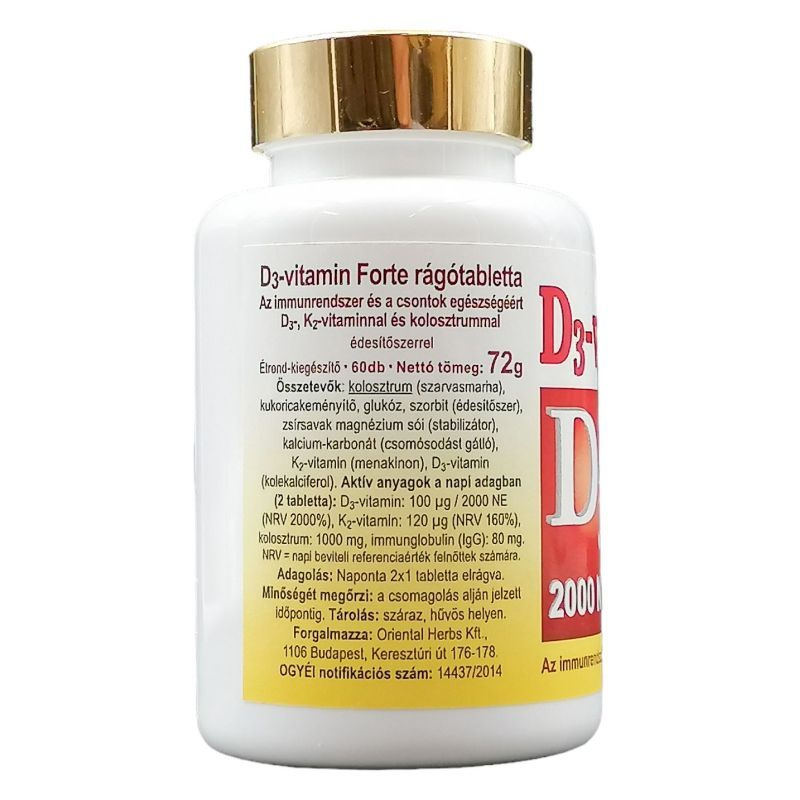 Összetevők: kolosztrum, kukoricakeményítő, glukóz, szorbit (édesítőszer), magnézium-sztearát (stabilizátor), kalcium-karbonát (csomósodást gátló), K2-vitamin (menakinon), D3-vitamin (kolekalciferol). Hatóanyagok a napi adagolásra napi 2 tablettában: D3-vitamin: 100 µg (NRV 2000%), K2-vitamin: 120 µg (NRV: 160%), kolosztrum: 1000 mg, immunglobulin (IgG): 80 mg. Adagolás (felhasználás): naponta 2x1 tabletta elrágva.