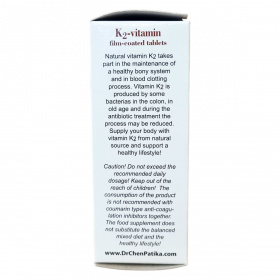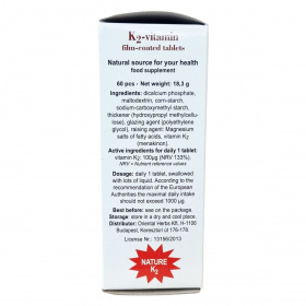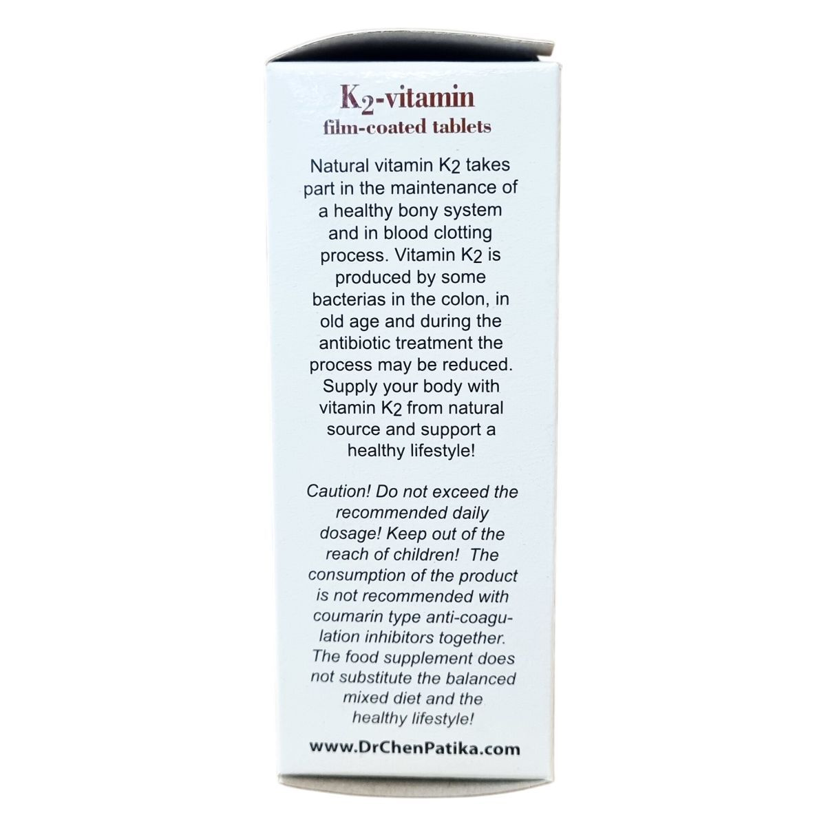 A K2-vitamin természetes formájában (menakinon) részt vehet az egészséges csontozat fenntartásában és a véralvadási folyamatokban. A vitamin néhány baktérium terméke a vastagbélben, ám az előállítása csökkenhet időskorban vagy antibiotikus kezelés során. Az étrend-kiegészítő pótlása természetes forrásból segítheti a szervezetet, különösen, ha az belső termelés csökken. A termék nem helyettesíti a kiegyensúlyozott vegyes étrendet és az egészséges életmódot. Felhívjuk a figyelmet, hogy a javasolt napi dózist nem szabad túllépni, és coumarin típusú véralvadásgátlóval egyidejűleg sem ajánlott a fogyasztása.