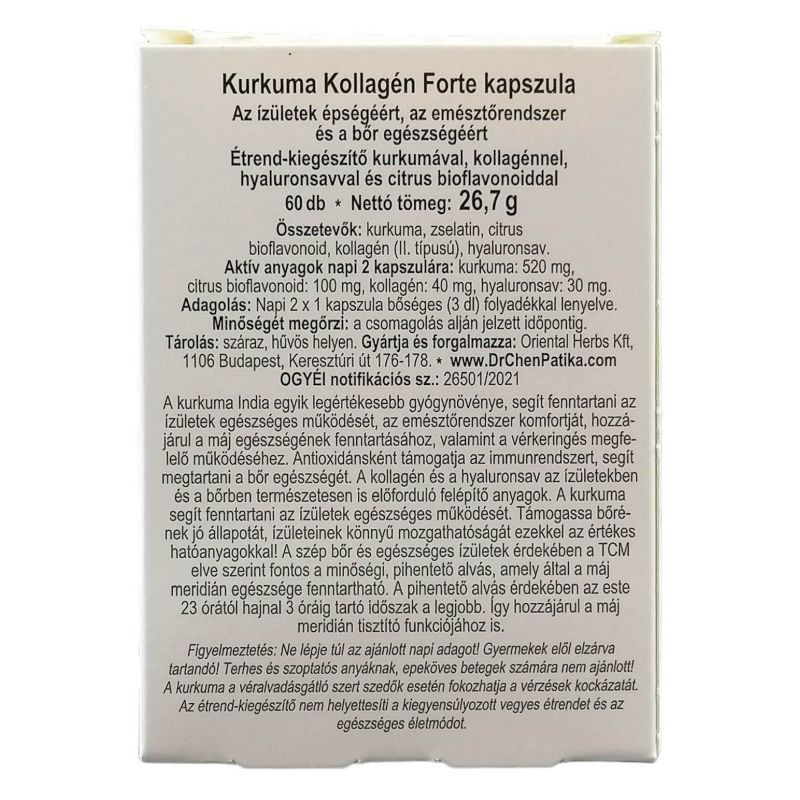Összetétel 2 kapszulában: kurkuma 520mg, citrus bioflavonoid 100mg, kollagén 40mg, hialuronsav 30mg