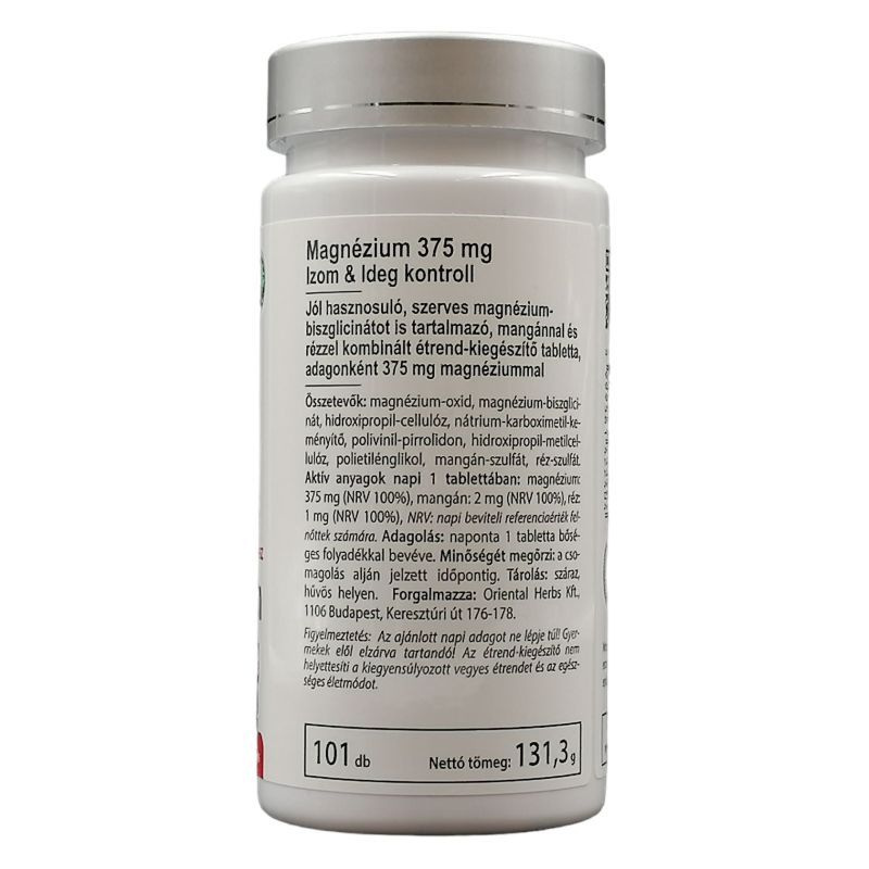 Jól hasznosuló szerves magnézium-biszglicinátot is tartalmazó mangánnal és rézzel kombinált tabletta adagonként 375 mg magnéziummal. A magnézium hozzájárul a normál izomműködéshez, és az idegrendszer normál működéséhez.