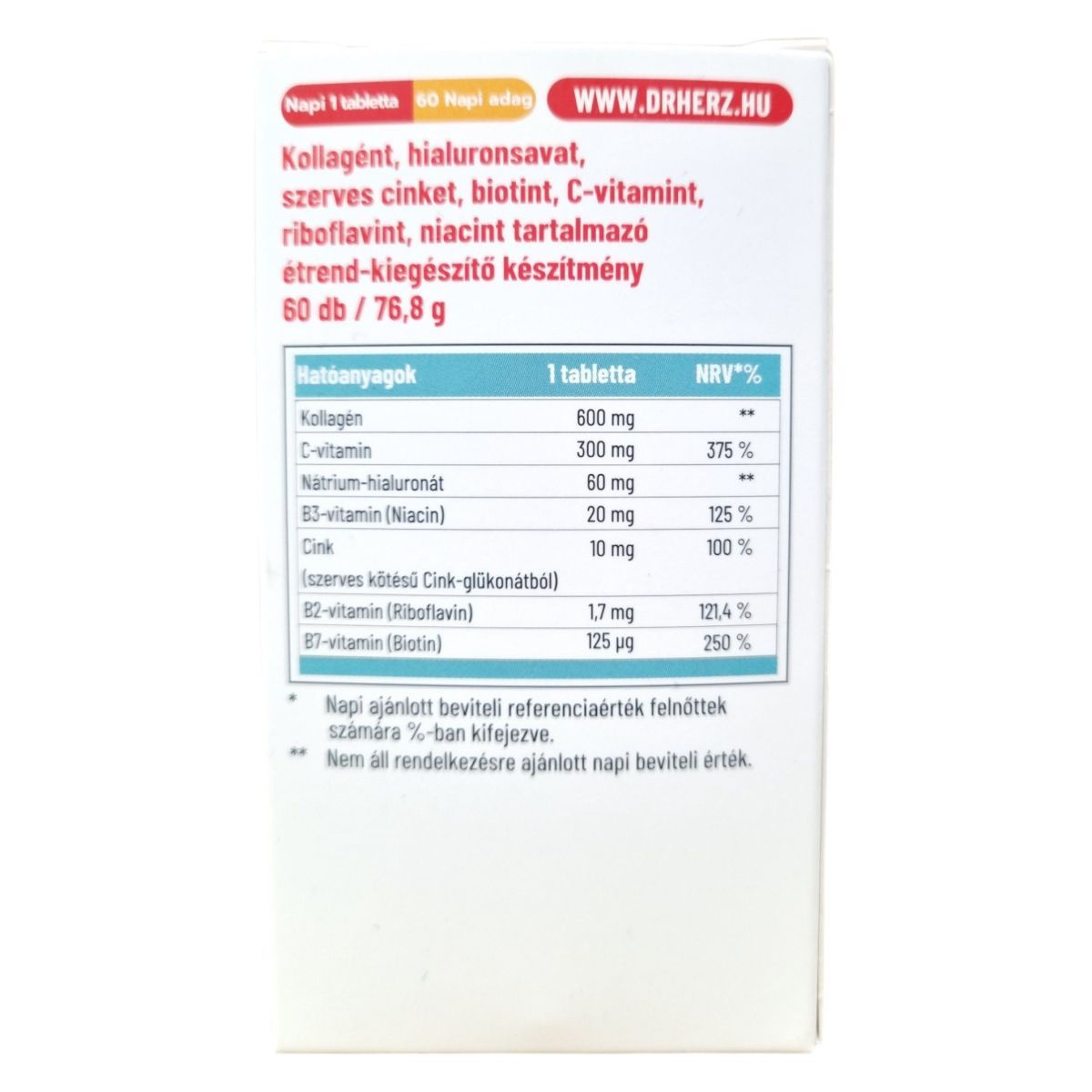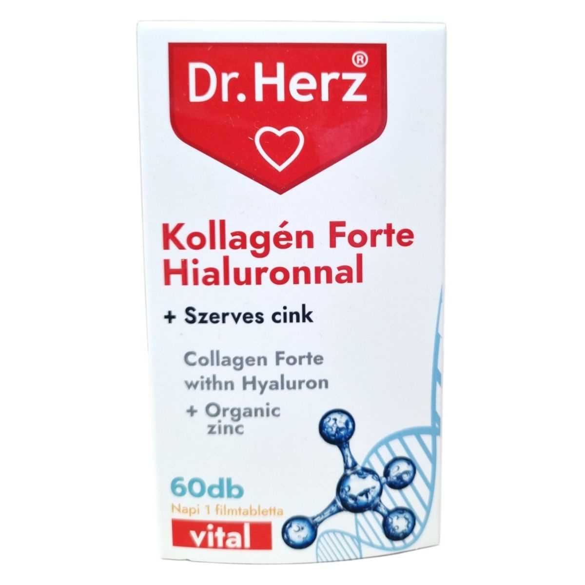 A Dr. Herz Kollagén Forte egy komplex étrend-kiegészítő, amely kollagént, hialuronsavat, szerves cinket, biotint, C-vitamint, riboflavint és niacint tartalmaz. Ezek az összetevők hozzájárulhatnak a bőr, haj és köröm egészségének támogatásához, valamint az immunrendszer erősítéséhez. A termék napi egy filmtabletta formájában fogyasztható, amelyet főétkezés után, bőséges folyadékkal ajánlott bevenni. A termék bio étrendi irányzatba sorolható, és az OGYÉI által notifikált. Tárolása szobahőmérsékleten, fénytől és nedvességtől védett helyen javasolt.