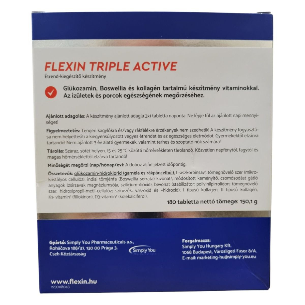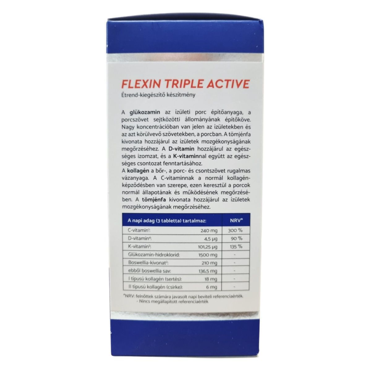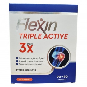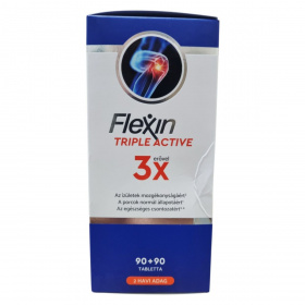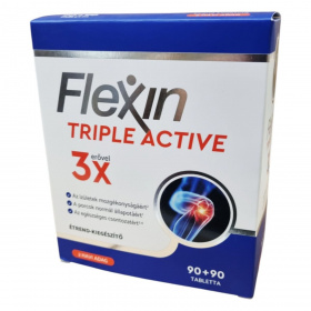 A Flexin Triple Active egy étrend-kiegészítő, amely glükozamin, Boswellia és kollagén tartalmával támogathatja az ízületek és porcok egészségét. A glükozamin az ízületi porc építőanyaga, míg a tömjénfa kivonata hozzájárulhat az ízületek mozgékonyságának megőrzéséhez. A D-vitamin az egészséges izomzat és csontozat fenntartásához járulhat hozzá. A termék 180 tablettát tartalmaz, ami 2 havi adagnak felel meg. A készítmény nem ajánlott tengeri kagylókra és/vagy rákfélékre érzékenyek számára, és nem helyettesíti a kiegyensúlyozott étrendet.