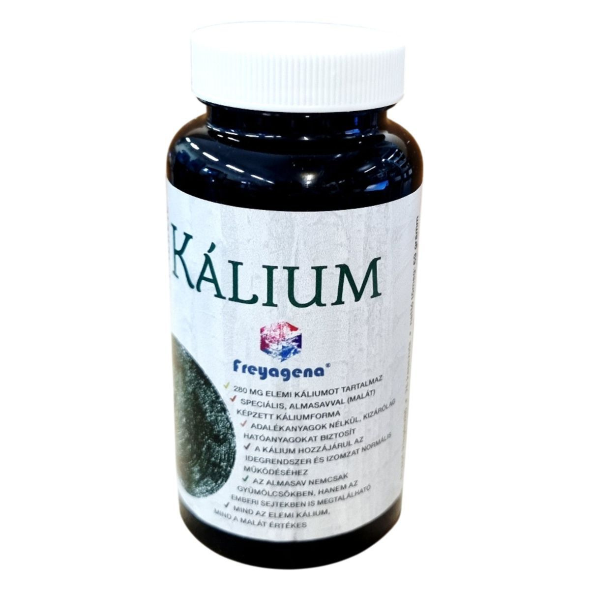 A freyagena Malát Kálium étrend-kiegészítő 280 mg elemi káliumot tartalmaz, amely speciális, almasavval képzett káliumformában van jelen. A termék adalékanyagok nélkül, kizárólag hatóanyagokat biztosít, és hozzájárulhat az idegrendszer és izomzat normál működéséhez.