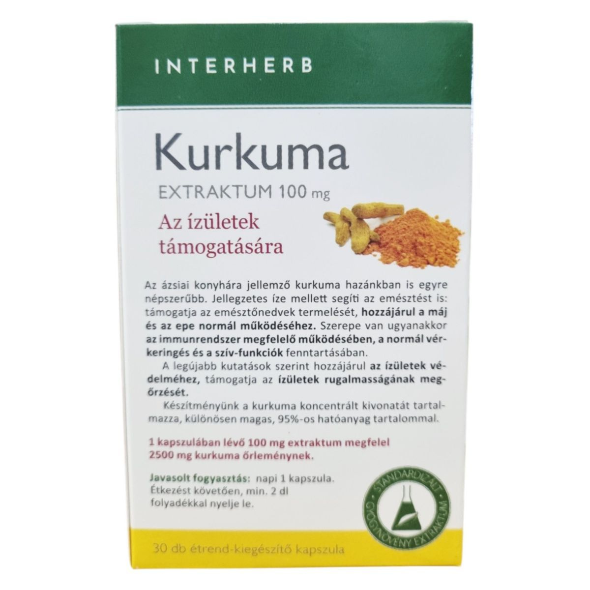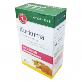 Az INTERHERB Kurkuma EXTRAKTUM 100 mg kapszula az ízületek támogatására készült, különösen magas, 95%-os kurkumin tartalommal. A kurkuma, amely az ázsiai konyha jellegzetes fűszere, hozzájárulhat az emésztőnedvek termeléséhez, a máj és az epe normál működéséhez, valamint az immunrendszer megfelelő működéséhez. A termék koncentrált extraktumot tartalmaz, amely 100 mg kivonat formájában 2500 mg növényi őrleménynek felel meg. A készítmény hazai fejlesztésű, bevizsgált alapanyagokból készült, és a megbízható minőséget garantálja.