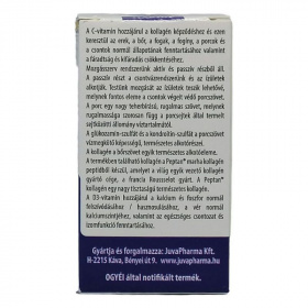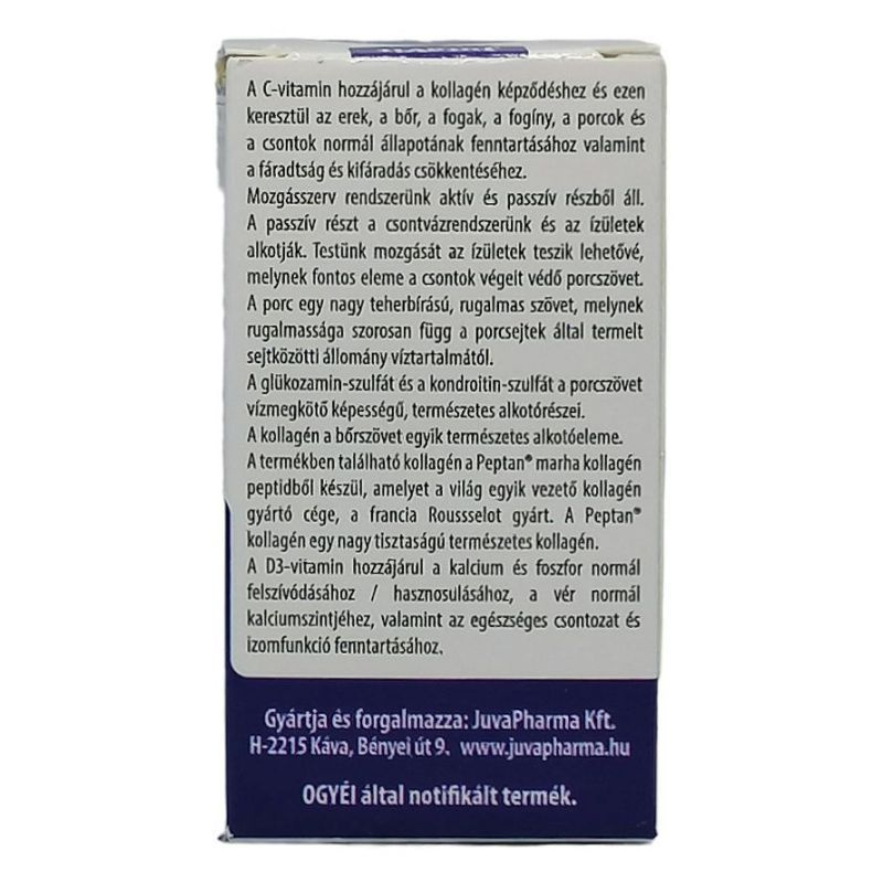 A C-vitamin hozzájárul a kollagén képződéséhez, amely az erek, a bőr, a fogak, a porcok és a csontok normál állapotának fenntartásához szükséges, valamint segíthet a fáradtság és kifáradás csökkentésében. A glükozamin és a kondroitin a porcszövet természetes alkotóelemei, míg a kollagén (Peptan®) marhából származó, nagy tisztaságú kollagén peptid. A D3-vitamin elősegíti a kalcium és foszfor felszívódását, hozzájárul a csontozat és izomfunkciók fenntartásához. Nettó tömeg: 96 g.