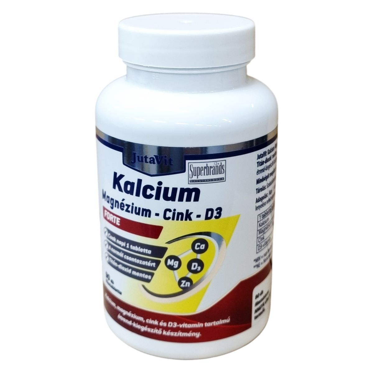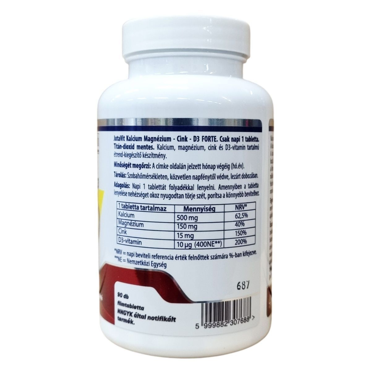 A JutaVit Kalcium Magnézium - Cink - D3 FORTE étrend-kiegészítő készítmény kalciumot és magnéziumot tartalmaz, melyek szükségesek a normál csontozat és fogazat fenntartásához, valamint hozzájárulhatnak a normál izomműködéshez. A magnézium emellett az idegrendszer megfelelő működéséhez is hozzájárulhat. A cink szerepet játszhat a csontozat, a bőr, a köröm és a haj normál állapotának fenntartásában, valamint az immunrendszer normál működésében. A D-vitamin elősegítheti a kalcium és a foszfor normál felszívódását és hasznosulását, továbbá támogathatja az egészséges csontozat, izomfunkció és a normál fogazat fenntartását. A termék titán-dioxid mentes, és 90 darab filmtablettát tartalmaz. Az adagolás napi egy tabletta, melyet folyadékkal szükséges bevenni, és igény esetén törhető vagy porítható a könnyebb bevitel érdekében.
