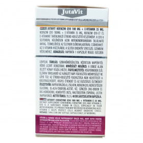 A JutaVit Koenzim Q10 100 mg + E-vitamin 35 mg lágyzselatin kapszulák koenzim Q10-et, valamint E-vitamint tartalmazó étrend-kiegészítők, melyek a sejtek mitokondriumában található anyagot pótolják. A koenzim Q10 termelődése az életkor előrehaladtával csökkenhet, míg az E-vitamin hozzájárulhat a sejtek oxidatív stresz elleni védelméhez. A készítmény napraforgóolajban diszpergált, állati eredetű zselatin kapszula formájában kerül forgalomba. A terméknek nincs meghatározott napi beviteli referencia értéke felnőttek számára. A kapszulák javasolt adagolása napi egy, amelyet reggel, egészben kell lenyelni, vízzel leöblítve. Fontos a termék gyermekektől való távol tartása, valamint, hogy az étrend-kiegészítő nem helyettesíti a változatos étrendet és az egészséges életmódot. A terméket szobahőmérsékleten, fénytől védve, az eredeti csomagolásban kell tárolni.