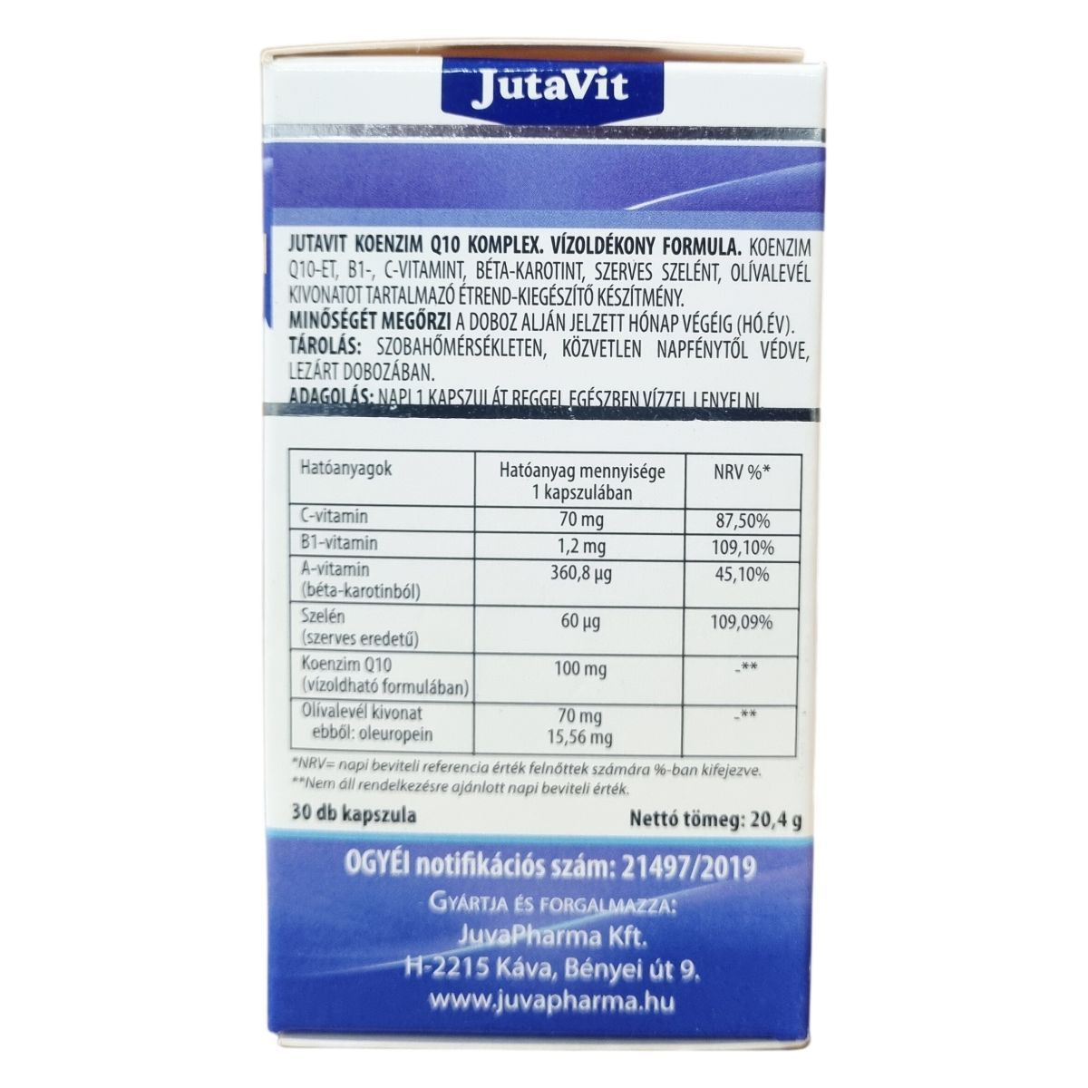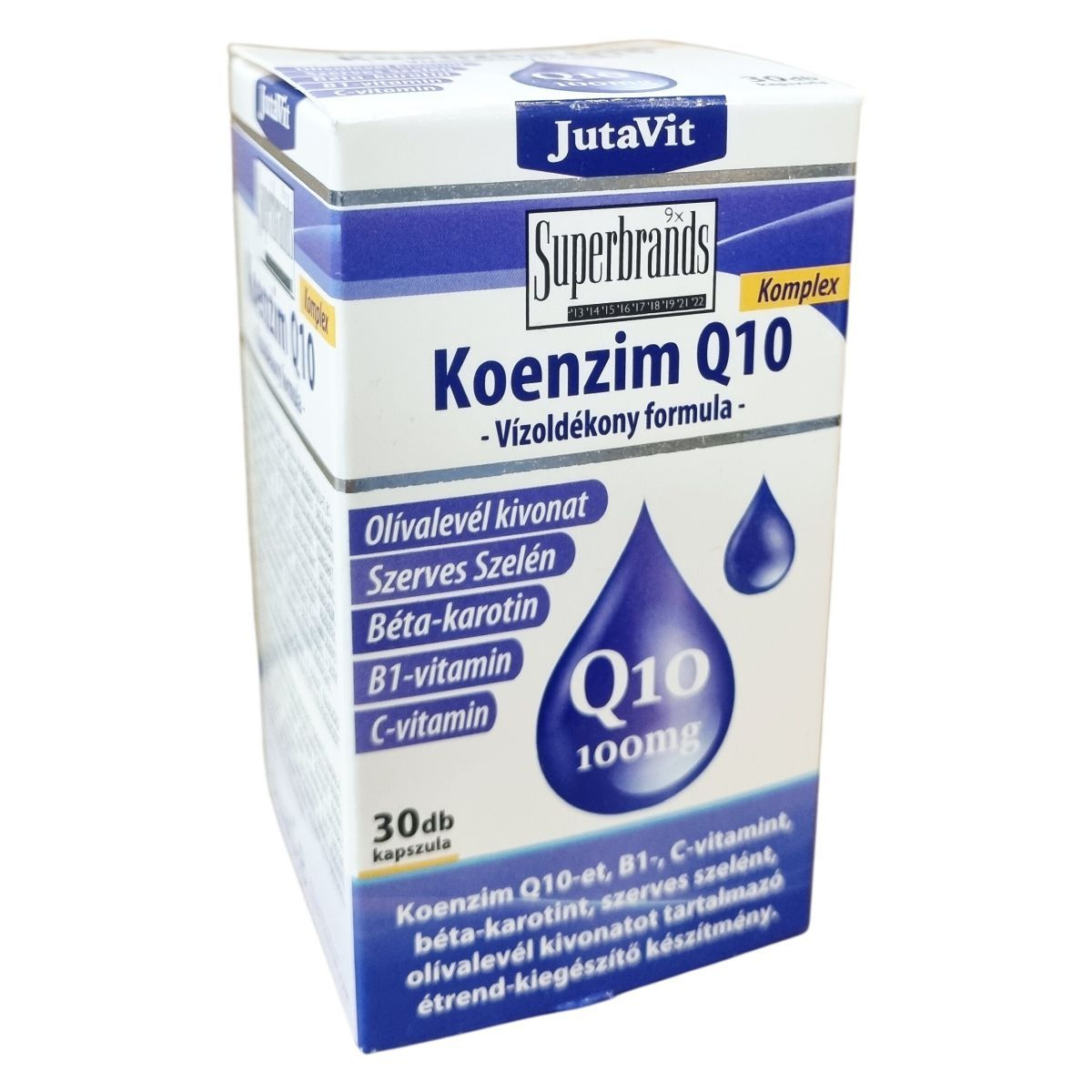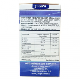 A JutaVit Komplex Koenzim Q10 kapszula egy vitaminokkal és szerves szelénnel kiegészített készítmény, amely továbbá olívalevél kivonatot és béta-karotint is tartalmaz. A termék vízoldékony koenzim Q10 formulát használ, amely 100 mg hatóanyagot biztosít egy adagban. A komplex összetétel hozzájárulhat az antioxidáns védelemhez és az általános jó közérzet támogatásához. A kapszulák száma 30 db, nettó tömegük 20,4 g. A termék szobahőmérsékleten, napfénytől védve, eredeti, lezárt csomagolásban tárolandó, és kizárólag felnőtt fogyasztóknak ajánlott az ajánlott mennyiség szerint.