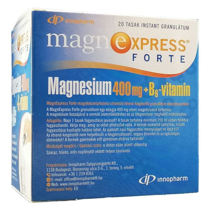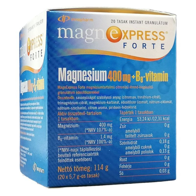 A magnézium hozzájárul a normál izomműködéshez és az idegrendszer megfelelő működéséhez. A MagnExpress Forte granulátum 1 adagja 400 mg elemi magnéziumot tartalmazó készítmény. Napi 1 tasak fogyasztása javasolt. Az étrend-kiegészítő nem helyettesíti a kiegyensúlyozott, vegyes étrendet és az egészséges életmódot.