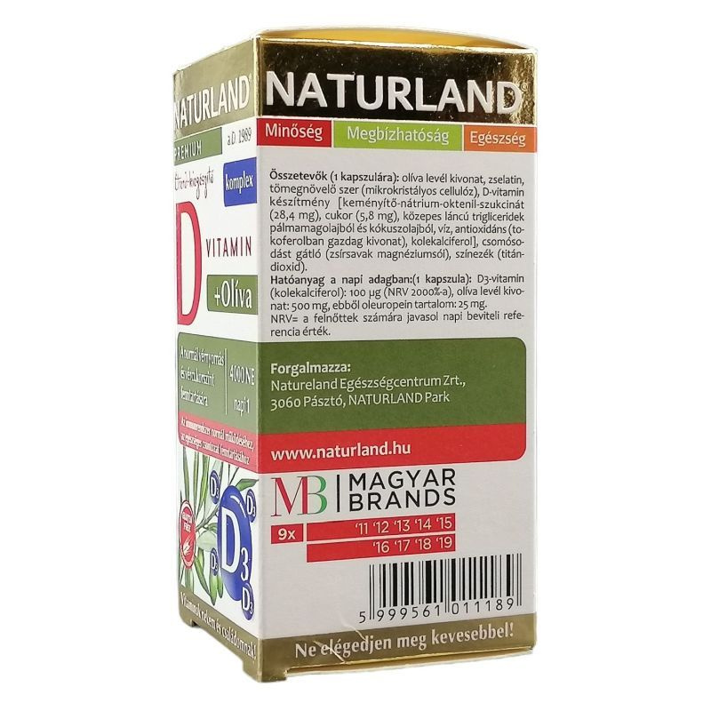 A D-vitamin hozzájárul az immunrendszer normál működéséhez, az egészséges csontozat és a vér normál kálcium szintjének a fenntartásához. Összetevők (1 kapszulára): olíva levél kivonat, zselatin, tömegnövelő szer (mikrokristályos cellulóz), D-vitamin készítmény [keményítő-nátrium-oktenil-szukcinát (28,4 mg), cukor (5,8 mg), közepes láncú trigliceridek pálmamagolajból és kókuszolajból, víz, antioxidáns (tokoferolban gazdag kivonat), kolekalciferol], csomósodást gátló (zsírsavak magnéziumsói), színezék (titán-dioxid).