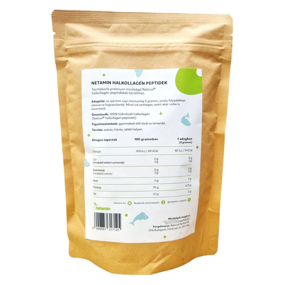 A Netamin Halkollagén Peptidek prémium minőségű Naticol halkollagén peptideket tartalmaz, amelyek semleges ízük miatt könnyen beilleszthetők a napi étrendbe. Az ajánlott napi mennyiség 5 gramm, amely folyadékban elkeverve fogyasztandó. A termék 100% hidrolizált halkollagént tartalmaz, és fontos, hogy gyermekek elől elzárva tartsuk. Tárolása száraz, hűvös, sötét helyen javasolt. Az energia- és tápérték adatok alapján a termék magas fehérjetartalommal rendelkezik, miközben zsír- és szénhidráttartalma elhanyagolható.