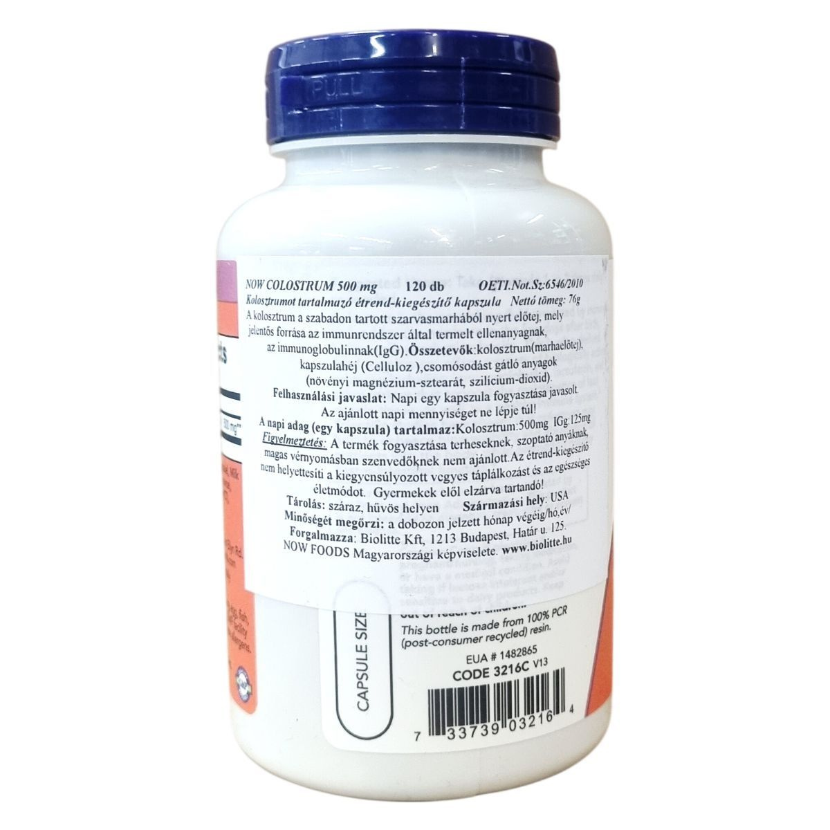 A now® Colostrum 500 mg egy étrend-kiegészítő, mely természetes módon előforduló immunoglobulinokat és laktoferrint tartalmaz marhakezdeményből. A termék BSE-mentes alapanyagból készül, és minőségét az USA-ban, globálisan beszerzett összetevőkből végzett minőségellenőrzés garantálja. A készítmény GMO-mentes, mesterséges növekedési hormonoktól mentes, természetes színváltozások előfordulhatnak. A kapszula növényi alapú, a termék mentes számos gyakori allergéntől és nem tartalmaz többek között élesztőt, búzát, glutént, szóját, tojást, halat, kagylót vagy szezámmagot.