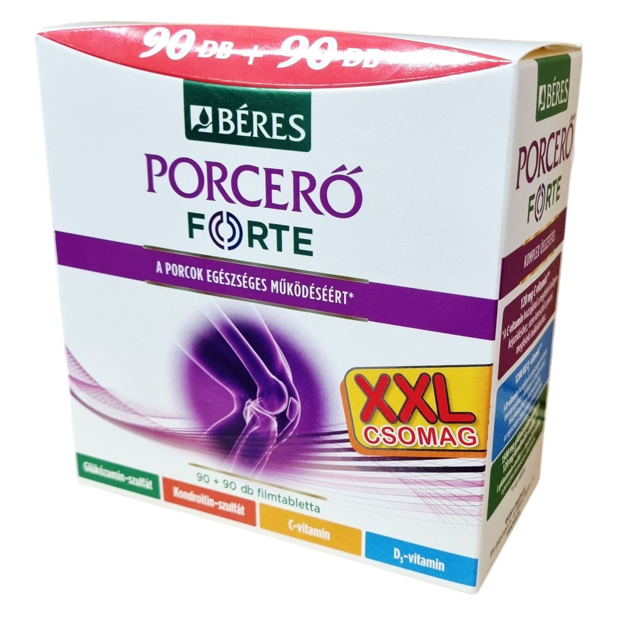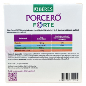 Béres Porceró FORTE filmtabletta komplex étrend-kiegészítő készítmény, mely C- és D3-vitamin, glükózamin-szulfát, valamint kondroitin-szulfát összetevőket tartalmaz, amelyek a napi adagban a porcszövet természetes alkotórészei és hozzájárulhatnak a porcok megfelelő működéséhez. A C-vitamin hozzájárulhat a megfelelő kollagénképződéshez, mely révén a porcok egészségesek maradhatnak. A D-vitamin támogathatja az egészséges csontozat fenntartását, a kalcium és foszfor normál felszívódását, valamint az izomfunkciók fenntartását. A készítmény ajánlott sportolók, idősebb felnőttek és idős korúak számára a porcok egészséges működésének segítésére. A doboz 90 db + 90 db 1,785 grammos filmtablettát tartalmaz. Tárolása száraz helyen, legfeljebb 25 °C-on javasolt. Hasznos tippek és további információk az egészséges életmódról elérhetők a gyártó mozgás szakértője oldalán.