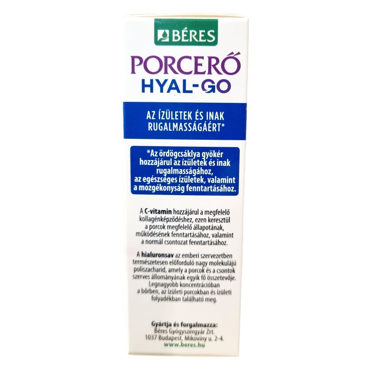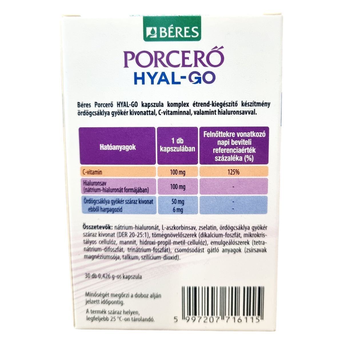 A Porcerő HYAL-GO kapszula alkalmazása javasolt a porcok egészséges működéséhez sportolóknak, idősebb felnőtteknek és idős korúaknak. Az ördögcsáklya gyökér hozzájárul az ízületek és inak rugalmasságához, valamint a mozgékonyság fenntartásához. A C-vitamin részt vesz a megfelelő kollagénképződésben, ezáltal támogatja a porcok és a csontozat normál állapotának fenntartását. A hialuronsav a porcok és ízületi folyadék természetes összetevője.