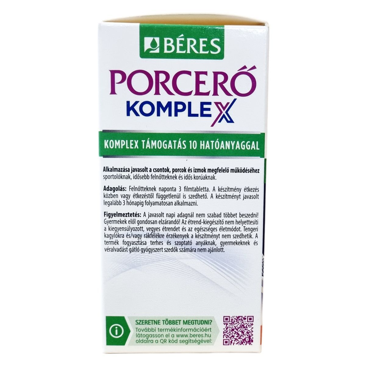 Béres Porcerő KOMPLEX filmtabletta étrend-kiegészítő készítmény C-vitaminnal, glükozamin-szulfáttal, kalciummal, magnéziummal, valamint további vitaminokkal és ásványi anyagokkal.