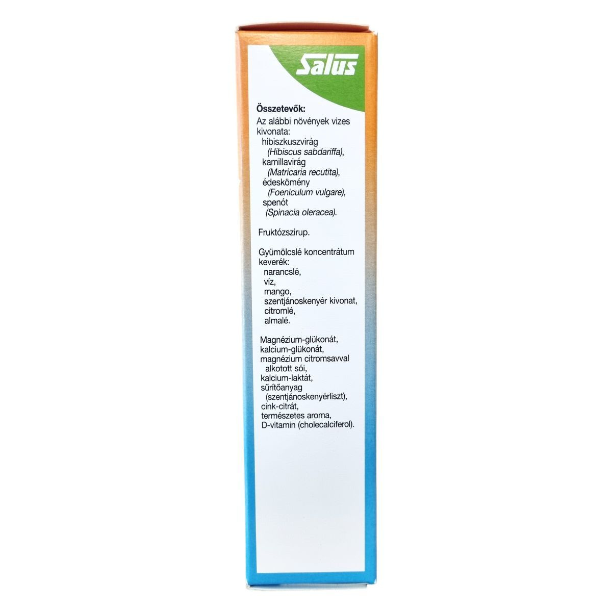 Hibiszkuszvirág vizes kivonat (Hibiscus sabdariffa), kamillavirág (Matricaria recutita), édeskömény (Foeniculum vulgare), spenót (Spinacia oleracea), fruktózszirup, gyümölcslé-koncentrátum keverék (narancslé, víz, mangó, citromlé, almalé), magnézium-glükonát, kalcium-glükonát, magnézium citromsavval alkotott sói, kalcium-laktát, sűrítőanyag (szentjánoskenyérliszt), cink-citrát, természetes aroma, D-vitamin (kolekalciferol).