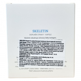 A Skeletin egy étrend-kiegészítő, amely kollagént, halolajat EPA és DHA zsírsavakkal, valamint csalánlevél- és csipkebogyó-kivonatot tartalmaz. A kapszula anyaga zselatin, glicerin és víz. A termék nettó tömege 135 kapszula, kapszulánként 750 mg. A készítményt az EU területén gyártják. Használat előtt konzultáljon egészségügyi szakemberrel, különösen terhesség és szoptatás idején, valamint allergiás reakciók esetén. Az ajánlott használat napi két kapszula étkezés után, kisgyermekek esetén az adag módosítható, és a készítmény alkalmazásakor a megnövelt folyadékbevitel javasolt. Az étrend-kiegészítő nem helyettesítheti az egészséges, változatos étrendet és életmódot.