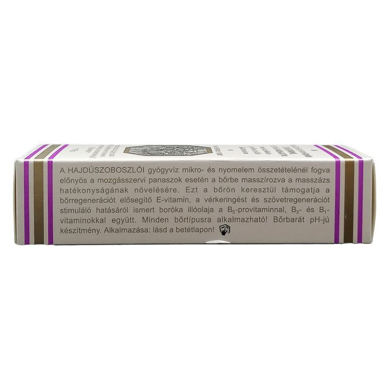 A Hajdúszoboszlói gyógyvíz - mikro-és nyomelem-tartalmánál fogva - kiválóan alkalmas mozgásszervi panaszok esetén a bőrön keresztül bejuttatva a reumatikus és izomfájdalmak csökkentésére és kezelésére. Könnyen felszívódó, zsíros nyomot nem hagyó, hatékonyan hidratáló és az oldott mikro-és nyomelemeket a bőr mélyebb rétegeibe is bejuttató professzionális masszázskrémbe nagy mennyiségben vittük be a gyógyvizet. Következésképpen megtapasztalhatja, hogy a krémet a bőrbe masszírozva a gyógyvizes kezelés és masszázs hatékonysága megnő.