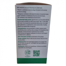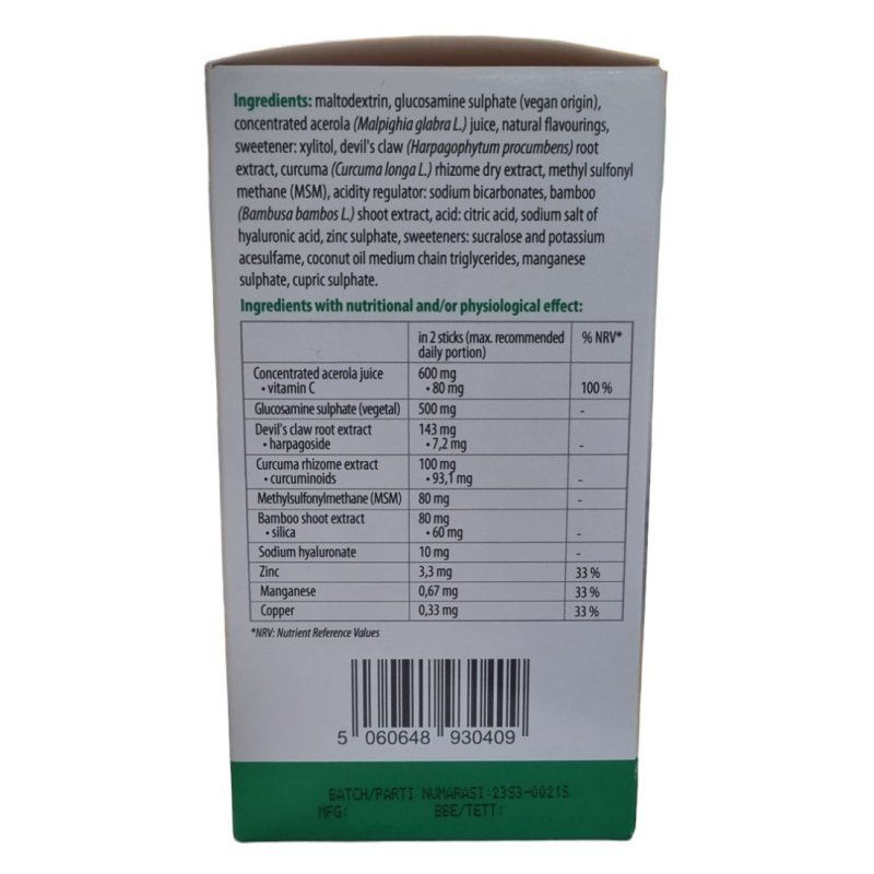 Összetevők: maltodextrin; glükózamin-szulfát (növényi eredetű); koncentrált acerola (Malpighia glabra L.) lé; természetes aromák; édesítőszer: xilit; ördögkarom (Harpagophytum procumbens) gyökér kivonat; kurkuma (Curcuma longa L.) rizóma száraz kivonat; metil-szulfonil-metán (MSM); savanyúságot szabályozó anyag: nátrium-karbonátok; bambusz (Bambusa bambos L.) rügykivonat; savanyúságot szabályozó anyag: citromsav; hialuronsav nátriumsói; cink-szulfát; édesítőszerek: szukralóz és kálium-aceszulfám; kókuszolaj közepes láncú trigliceridei; mangán-szulfát; réz-szulfát.