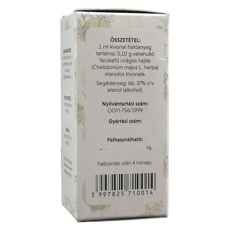Gyógyszernek nem minősülő gyógyhatású készítmény, mely szemölcs és tyúkszem eltávolítására szolgál. A hatást szakirodalmi adatok igazolják. Mi a hatóanyaga? 30 ml kivonat 3 g vérehulló fecskefű hajtásrészének alkoholos kivonatát tartalmazza. Mit tartalmaz még a készítmény? Segédanyagként a készítmény 40 tf %-os alkoholt tartalmaz.