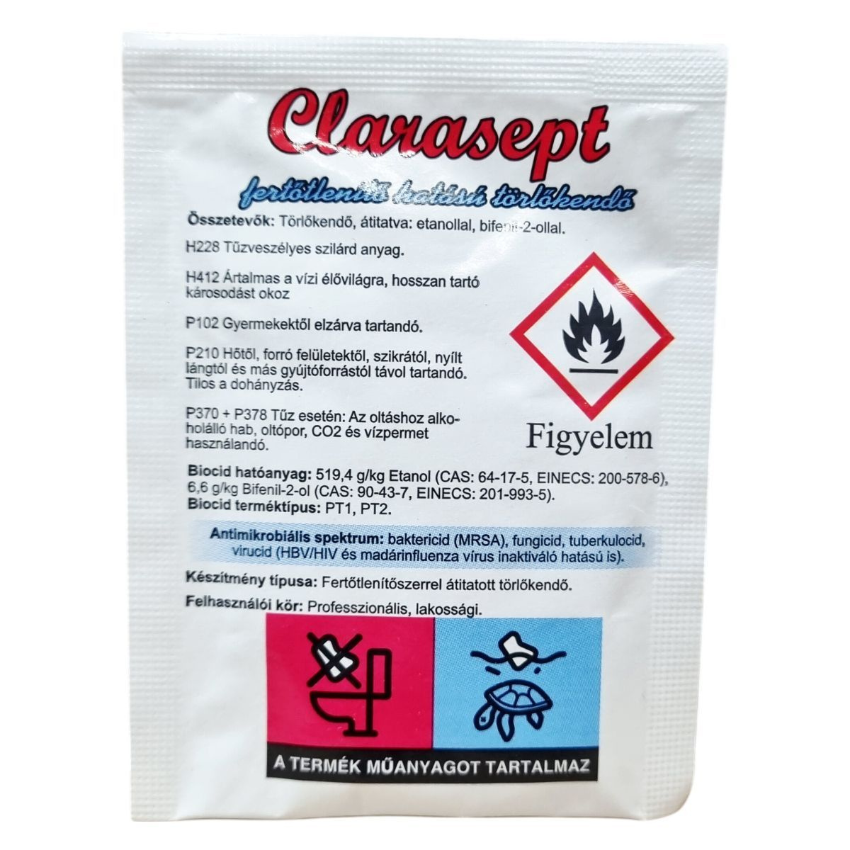 A Clarasept fertőtlenítő törlőkendő biocid terméktípus szerint PT1 és PT2-es készítmény, mely baktericid, fungicid, tuberkulocid, valamint virucid hatású, ideértve az HBV/HIV és madárinfluenza vírus inaktiválását is. A termék alkohol és bifenil-2-ol hatóanyaga révén hatékonyan alkalmas higiénés kézfertőtlenítésre, valamint eszközök és különböző felületek egyszerű és gyors fertőtlenítésére. Használata során nem szükséges víz alkalmazása, így praktikus megoldást nyújt szaniter helyiségekben vagy forgalmas közintézményekben. Elsősegély esetén, ha szembe kerül, a szemet langyos folyó vízzel legalább 5 percig ki kell öblíteni, és szükség esetén orvosi segítséget kell kérni. A készítmény műanyagot tartalmaz, ezért használat után a hulladékot megfelelően kell kezelni, nem juttatható élővízbe, közcsatornába vagy talajba. Kizárólag az eredeti, bontatlan csomagolásban, száraz, hűvös helyen őrizze meg hatékonyságát.