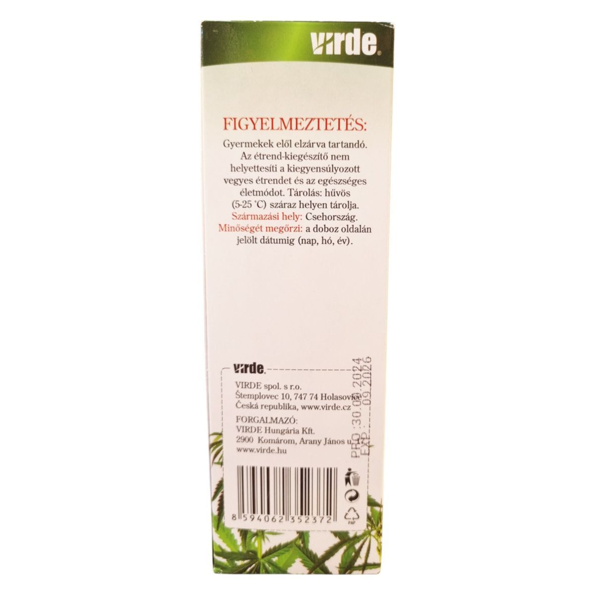 A Virde Kendermag Olaj egy hidegen sajtolt étrend-kiegészítő, amely 100% kendermagolajat tartalmaz, kiegészítve E-vitaminnal. Az optimális omega-6/omega-3 zsírsav aránya miatt hozzájárulhat a szív- és érrendszer egészségéhez, valamint segíthet a koleszterin- és trigliceridszint kontrolljában. Az E-vitamin tartalma támogathatja a sejtek védelmét az oxidatív stresszel szemben. A termék Csehországból származik, és a VIRDE Hungária Kft. forgalmazza Magyarországon.