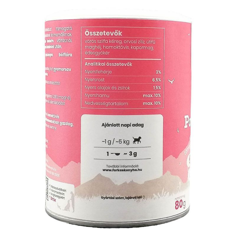 Érzékeny emésztésű kutyák számára kifejlesztett gyógynövénykeverék. Ajánlott étrendváltáskor, utazások alkalmával, gyógyszeres kezeléseket, féreghajtást követően, valamint stresszes élethelyzetekben és az érzékeny pocak támogatására a mindennapokban. Támogatja az egészséges bélflóra fenntartását: Az édesgyökér támogatólag hat gyomorsav problémák, reflux esetén. A kapormag elősegítheti az emésztést puffadás esetén. A vörös szilfakéreg, az egyiptomi útifű maghéj és az orvosi ziliz a gyomor és bélműködést támogatja. A színes, bogyós termésű homoktövis karotinoidokban, bioflavonoidokban gazdag, bővelkedik vitaminokban és ásványi anyagokban.Tudtad-e?
