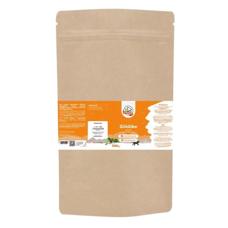 A Zöldike gazdag vitamin és ásványianyag tartalmú szárított zöldségekből gondosan összeállított zöldség mix. Tartalmaz sárgarépát, céklát, paszternákot, zellert és parajlevelet. BARF étrend esetén a ballasztanyagok biztosításához elengedhetetlenek a zöldségek. A kutyák, egészséges étrendjéhez a hús mellett hozzátartoznak a zöldségek is, hiszen ha vadon élnének, és lehetőségük lenne rá, megennék a zsákmányállataik gyomortartalmát is, amely nyilvánvalóan tartalmaz növényi eredetű összetevőket - zöldséget, gabonát is. A szárított zöldségeink úgy készülnek, hogy a zöldségekből alacsony hőmérsékleten történő szárítással kivonják a vizet. A víz elillan, megmarad viszont a zöldségek vitamin és ásványianyag tartalmának legnagyobb része. Ajánlott napi adag: 100gramm Zöldike körülbelül 800gramm friss zöldségnak felel meg. Ha 100gramm zöldséget szeretnél adni kedvencednek, ~12gramm Zöldikére van hozzá szükséged. 1 evőkanál Zöldike ~6gramm. A megadott napi mennyiség csak általános ajánlás, a napi ajánlott bevitel egyedenként eltérő lehet, függ kedvenced étrendjétől, aktivitásától, életkorától. Adagolás: Áztasd be azonos mennyiségű langyos / meleg vízbe, és hagyd 15-30 percig ázni. Az emészthetőség további javítása érdekében egy botmixerrel pillanatok alatt tovább apríthatod a pelyheket. Mindig frissen áztatott zöldséget adj kedvencednek. Ha azt tapasztalod, hogy kedvenced nem szívesen eszi a zöldségeket, keverd el egy kis joghurttal, vagy esetleg mézzel, így sokkal ízletesebb, és még mindig nagyon egészséges. Vízelvonás hatására szerencsére nem változik meg a zöldség szerkezete, ezért víz hozzáadásával a szárított termékek újra az eredetit megközelítő állapotúak lesznek. A Farkaskonyha által forgalmazott szárított zöldségek pici, 2-4mm méretű dara formában kerülnek a zacskókba, a minél könnyebb emészthetőség érdekében. Ezért válaszd: Gazdag vitamin és ásványianyag tartalmú. BARF étrend esetén a ballasztanyagok biztosításához elengedhetetlenek a zöldségek. Száraz, hűvös helyen, közvetlen napfénytől óvva tárold. Összetevők: szárított sárgarépa, cékla, paszternák, zeller, parajlevél.