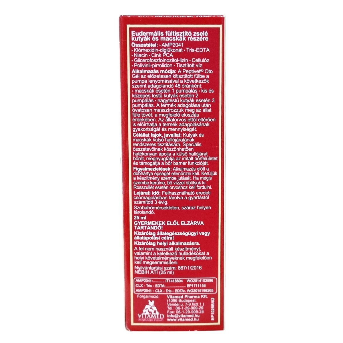 A Peptivet® Oto Gél egy eudermális, azaz a bőr természetes egyensúlyát támogató fültisztító készítmény kutyák és macskák számára. Kíméletesen tisztítja a külső hallójáratot az irritált bőrfelület nyugtatása mellett, és segíti a bőr barrier funkciójának fenntartását. Alkalmazása során a forelékező szennyeződéseket az előzetes tisztítást követően adagolja a fülbe az eszköz segítségével, majd a fül tövének megmasszírozásával biztosítja a hatóanyagok egyenletes eloszlását. A készítmény kizárólag helyi használatra készült, és csak állategészségügyi vagy állatápolási célokra alkalmazható. Használat közben kerüljük a szembe jutást, és ügyeljünk arra, hogy gyermekek ne férhessenek hozzá. A fel nem használt anyagot, valamint a keletkező hulladékokat a helyi előírásoknak megfelelően kell megsemmisíteni. A termék 25 ml-es kiszerelésben érhető el, és az eredeti csomagolásban, száraz, szobahőmérsékletű helyen tárolva akár három évig használható fel.