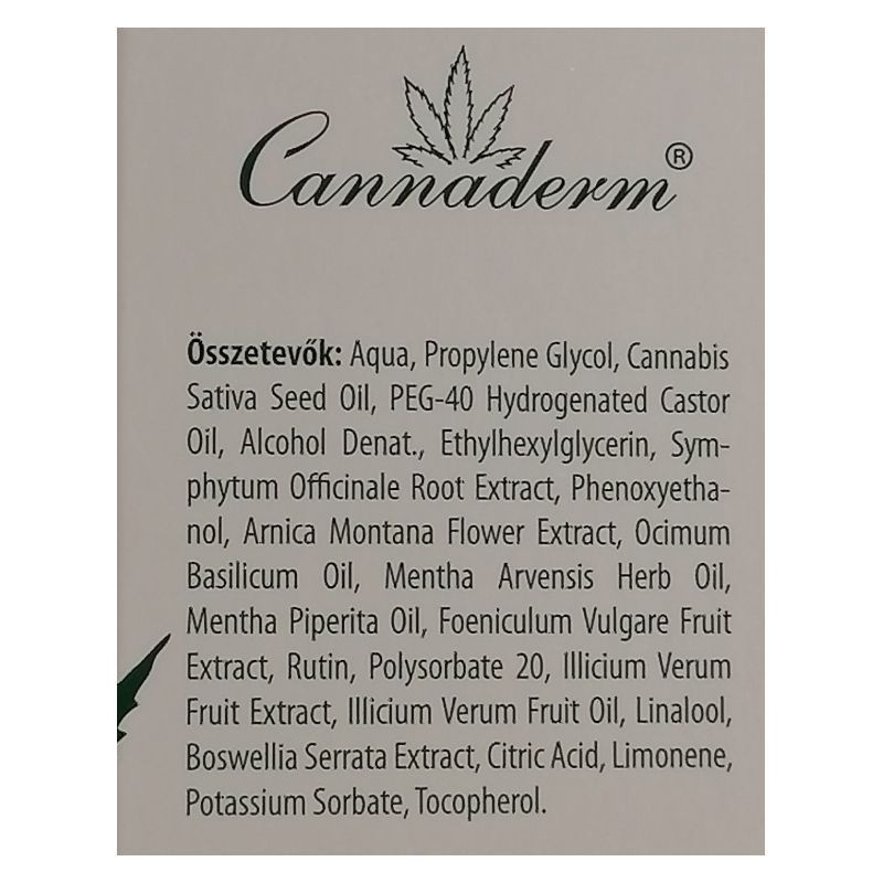 Összetevők: Aqua, Propylene Glycol, Cannabis Sativa Seed Oil, PEG-40 Hydrogenated Castor Oil, Alcohol Denat., Ethylhexylglycerin, Symphytum Officinale Root Extract, Phenoxyethanol, Arnica Montana Flower Extract, Ocimum Basilicum Oil, Mentha Arvensis Herb Oil, Mentha Piperita Oil, Foeniculum Vulgare Fruit Extract, Rutin, Polysorbate 20, Illicium Verum Fruit Extract, Illicium Verum Fruit Oil, Linalool, Boswellia Serrata Extract, Citric Acid, Limonene, Potassium Sorbate, Tocopherol.