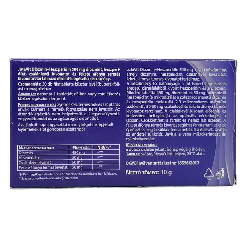 Adagolás: naponta 1 tablettát délben vagy este étkezés közben egészben lenyelni. Napi adag tartalmaz: Diozmin 450mg, Heszperidin 50mg, Csalánlevél kivonat 50mg, Fekete áfonya termés kivonat 50mg. Összetevők: diozmin, tömegnövelő szerek (dikalcium-foszfát, hidroxi-metil-cellulóz), heszperidin, csalálevél kivonat, fekete áfonya kivonat, csomósodást gátló (szilícium dioxid, magnézium-sztearát, talkum), fényező anyag (sztearin sav, kókusz olaj), színezékek (titán-dioxid, vörös vas oxid, sárga vas oxid), nedvesítőszer (polidextróz). Tárolás: Száraz, fényvédett helyen, 25C alatt. Fontos figyelmeztetés: A termék gyermekek kezelésére nem alkalmas. Terhesség és szoptatás alatt a termék fogyasztása nem javasolt. Az étrend-kiegészítő nem helyettesíti a kiegyensúlyozott, vegyes étrendet és az egészséges életmódot. Az ajánlott napi fogyasztási mennyiséget ne lépje túl! Gyermekek elől gondosan elzárva tartandó!
