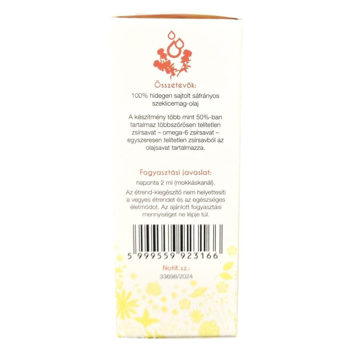 Ez a termék 100%-ban hidegen sajtolt sáfrányos szeklicemag-olajat tartalmaz, mely omega-6 és olajsav zsírsavakat biztosíthat a szervezet számára.