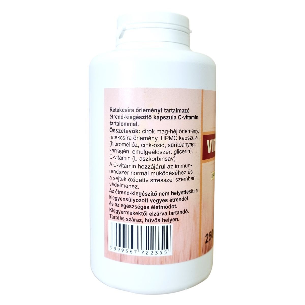 Retekcsíra őrleményt és C-vitamint tartalmazó étrend-kiegészítő kapszula, amely hozzájárul az immunrendszer normál működéséhez és a sejtek oxidatív stresszel szembeni védelméhez.
