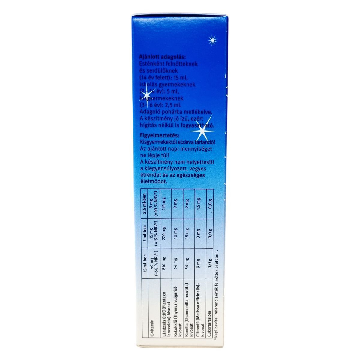 15 ml-ben 46 mg C-vitamin (=58 % NRV*), lándzsás útifű-kivonat 810 mg, kakukkfű-kivonat 54 mg, kamilla-kivonat 54 mg, citromfű-kivonat 9 mg, cukortartalom 0,0 g