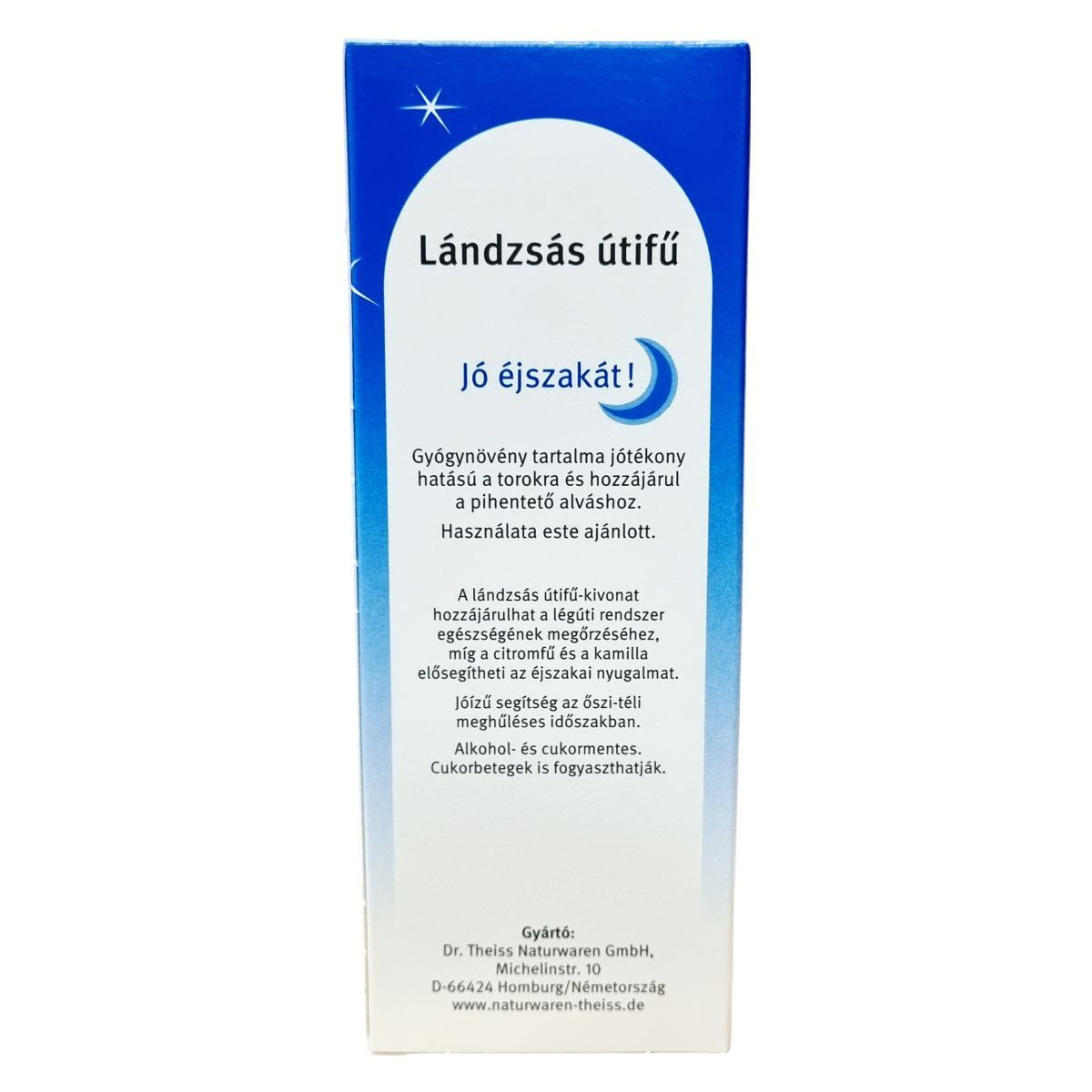 A Dr. Theiss Lándzsás útifű Jó éjszakát! folyékony étrend-kiegészítő lándzsás útifű-, kakukkfű-, kamilla-, citromfű-kivonatot és C-vitamint tartalmaz. A gyógynövénykivonatok jótékony hatásúak lehetnek a torokra, hozzájárulhatnak a pihentető alváshoz, valamint az őszi-téli meghűléses időszak kellemesebb átvészeléséhez. A lándzsás útifű-kivonat támogathatja a légúti rendszer egészségének megőrzését, míg a kamilla és citromfű elősegíthetik az éjszakai nyugalmat. A készítmény alkohol- és cukormentes, ezért cukorbetegek is fogyaszthatják. Jó ízű, így hígítás nélkül is fogyasztható, adagoló pohárka mellékelve. Túlzott fogyasztása hashajtó hatású lehet.
