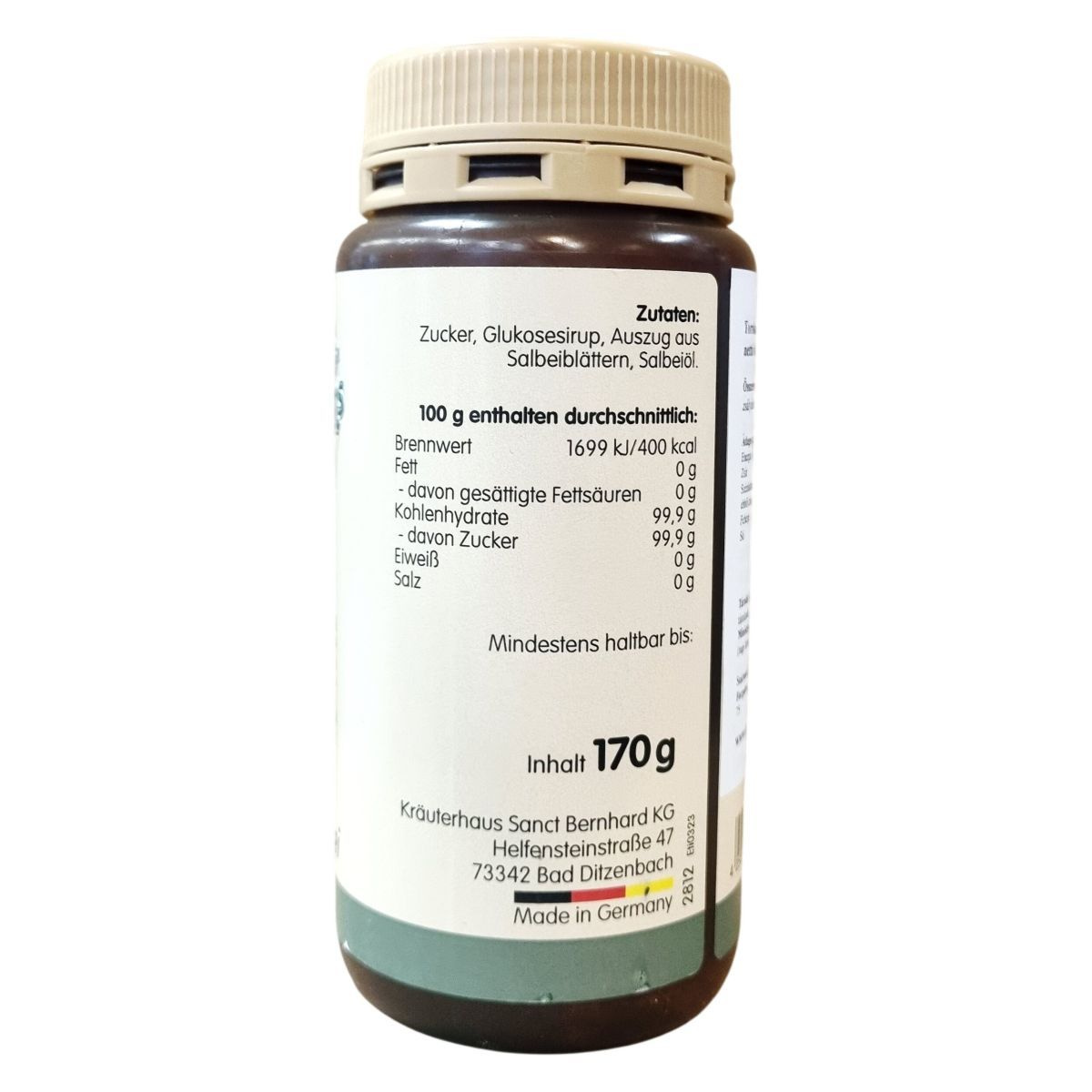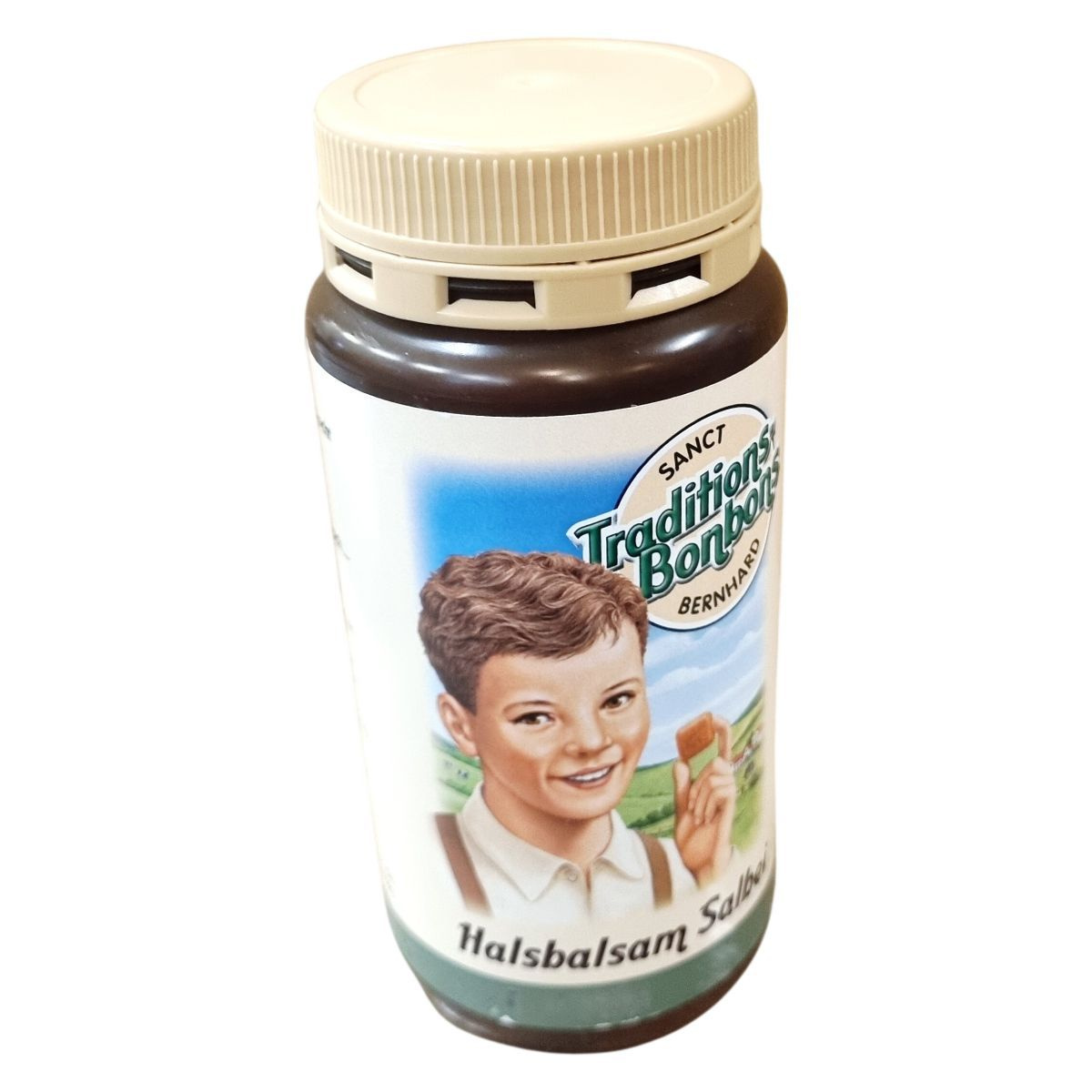 A SANCT Traditions-Bonbons BERNHARD Halsbalsam Salbei egy zsályával készült torokcukorka, amely cukrot és glükózszirupot tartalmaz. A termék kivonatot és olajat tartalmaz a zsályalevelekből, és Németországban készül. Nettó tömege 170 g. A tárolást hűvös, száraz helyen, 25 °C alatt javasolt végezni.
