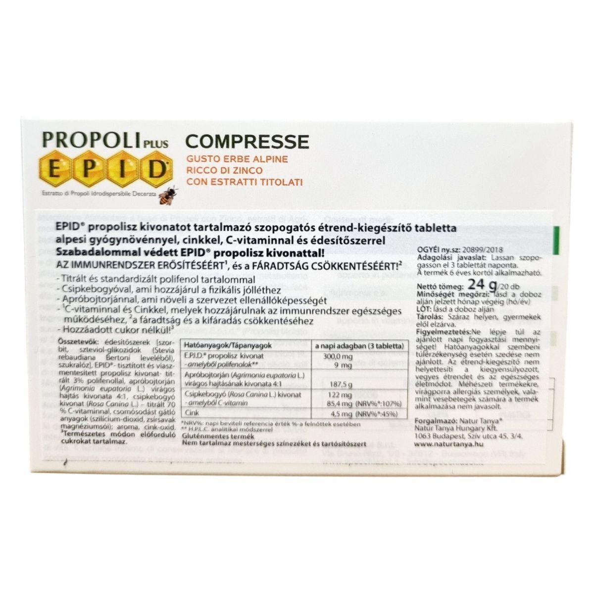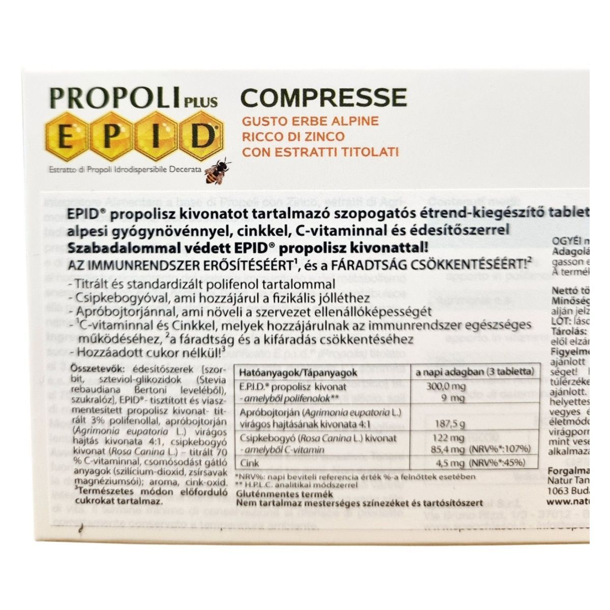 EPID propolisz kivonatot tartalmazó szopogató étrend-kiegészítő tabletta alpesi gyógynövényekkel, cinkkel, C-vitaminnal és édesítőszerrel. Szabadalommal védett EPID® propolisz kivonattal az immunrendszer erősítéséért és a fáradtság csökkentéséért. Titrált és standardizált polifenol tartalommal. Apróbojtorjánnal a szervezet ellenállóképességéért. C-vitaminnal és cinkkel az immunrendszer normál működéséhez és a kifáradás csökkentéséhez. Nem tartalmaz mesterséges színezékeket és tartósítószert.