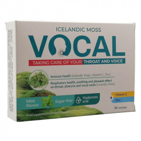 Nyugtató és kellemes hatással van a torokra, garatra és a hangszálakra. Védi a száj és a torok nyálkahártyáját. A C-vitamin, hialuronsav és a cink hozzájárul az immunrendszer megfelelő működéséhez és védi a sejteket az oxidatív stressztől. A Vocal HA szopogató tabletta menta ízben izlandi zuzmót, C-vitamin, hialuronsav és cink elegyet tartalmaz.