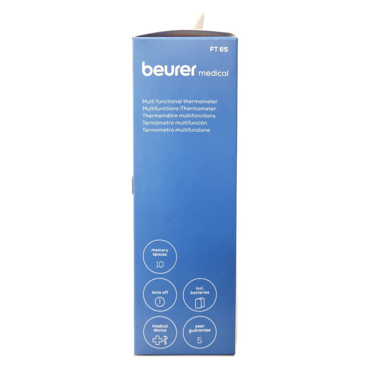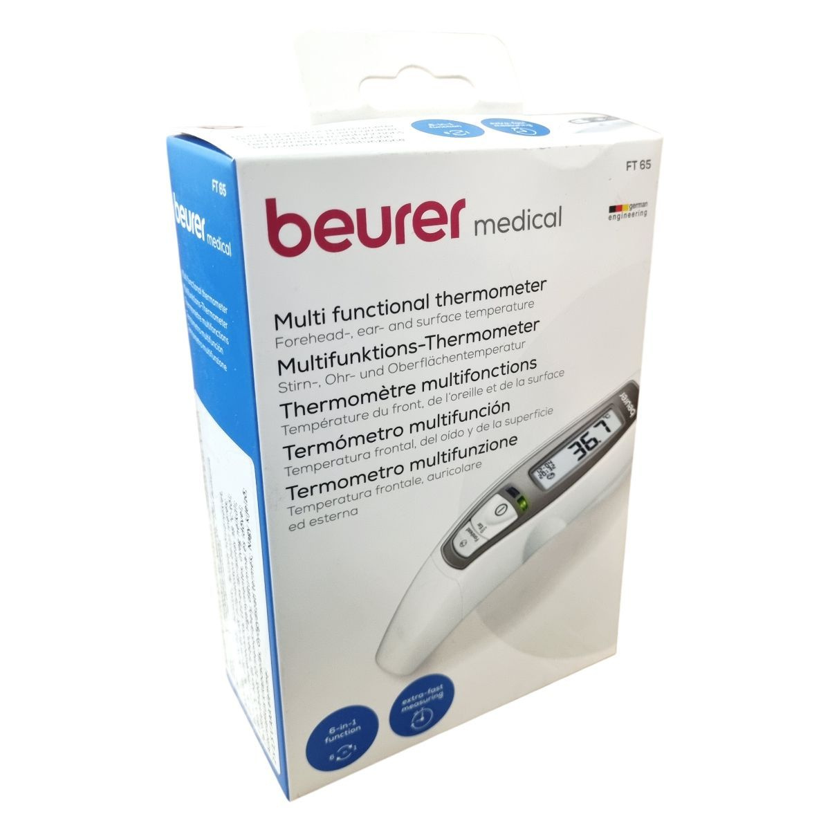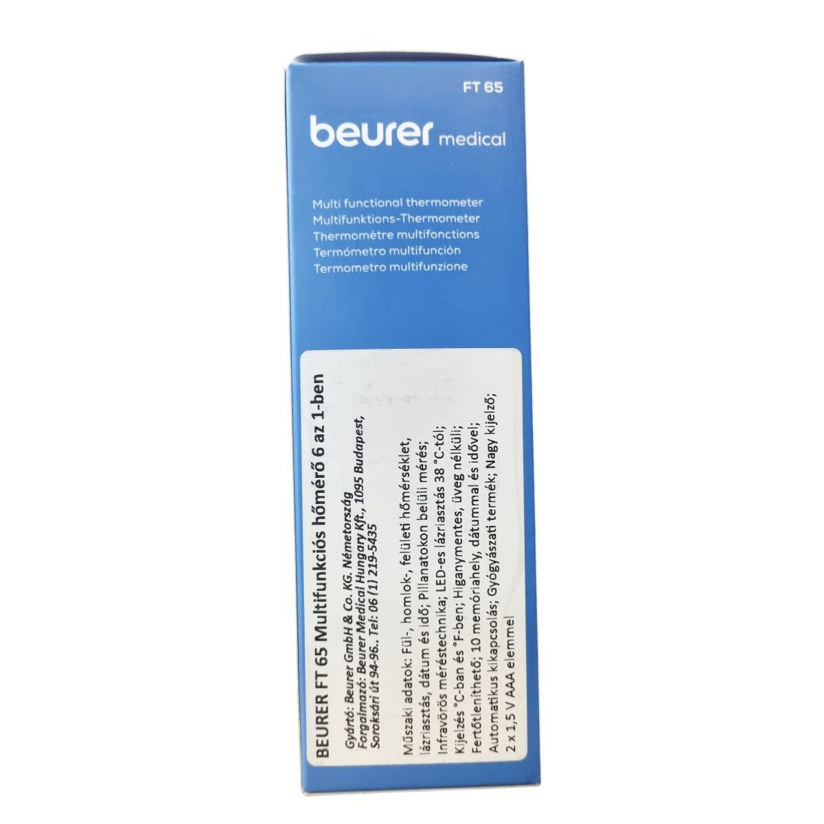 A Beurer FT 65 egy hat az egyben multifunkciós hőmérő, amely infravörös méréstechnológiát alkalmazva pillanatok alatt mér homlok-, fül- és felületi hőmérsékletet. A készülék lázriasztással rendelkezik, amely 38 °C-tól vörös LED fényjelzéssel figyelmeztet. A nagy kijelzőn megjelenik a mérési eredmény, a dátum és az idő, így a mérések könnyen nyomon követhetők a 10 memóriahelynek köszönhetően. A hőmérő higanymentes és üveg nélküli, ezért biztonságosan használható, fertőtleníthető, valamint az automatikus kikapcsolás segíti az elemkímélést. A működési hőmérséklet 15 °C és 35 °C között van, az elemek 2 db 1,5 V AAA típusú akkumulátor. A műszer orvosi eszköznek minősül, és német mérnöki pontossággal készült.