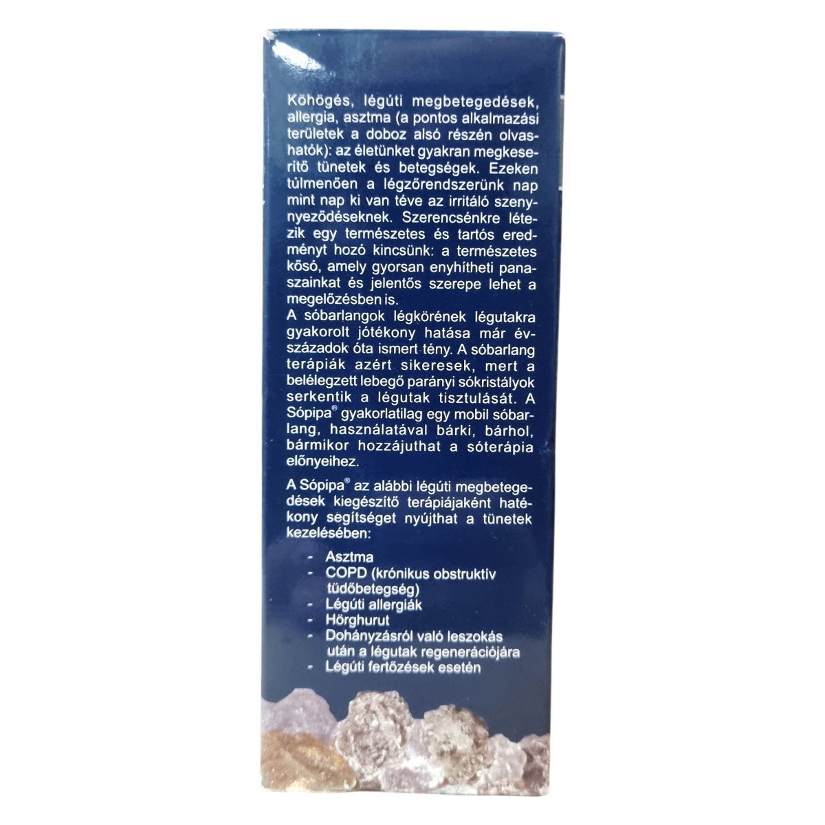 A Sópipa2® segíthet légúti megbetegedések, mint az asztma, COPD, légúti allergiák, hörghurut, valamint dohányzásról való leszokás után a légutak regenerációjában és légúti fertőzések esetén. A termék természetes kősóból készül, amely a sóbarlangok légkörének előnyeit nyújtja otthon is. A belélegzett sókristályok serkentik a légutak tisztulását és a természetes öntisztító folyamatokat. A kezelés segíti a nehezen kiürülő légúti váladék könnyebb távozását köhögéssel és orrfolyással, így gyorsíthatja a tünetek enyhülését és hozzájárulhat a megelőzéshez is. A sótöltet a doboz felbontásától számított egy évre elegendő hatóanyagot tartalmaz. A készüléket csak a külső felületén enyhén nedves ruhával szabad tisztítani.
