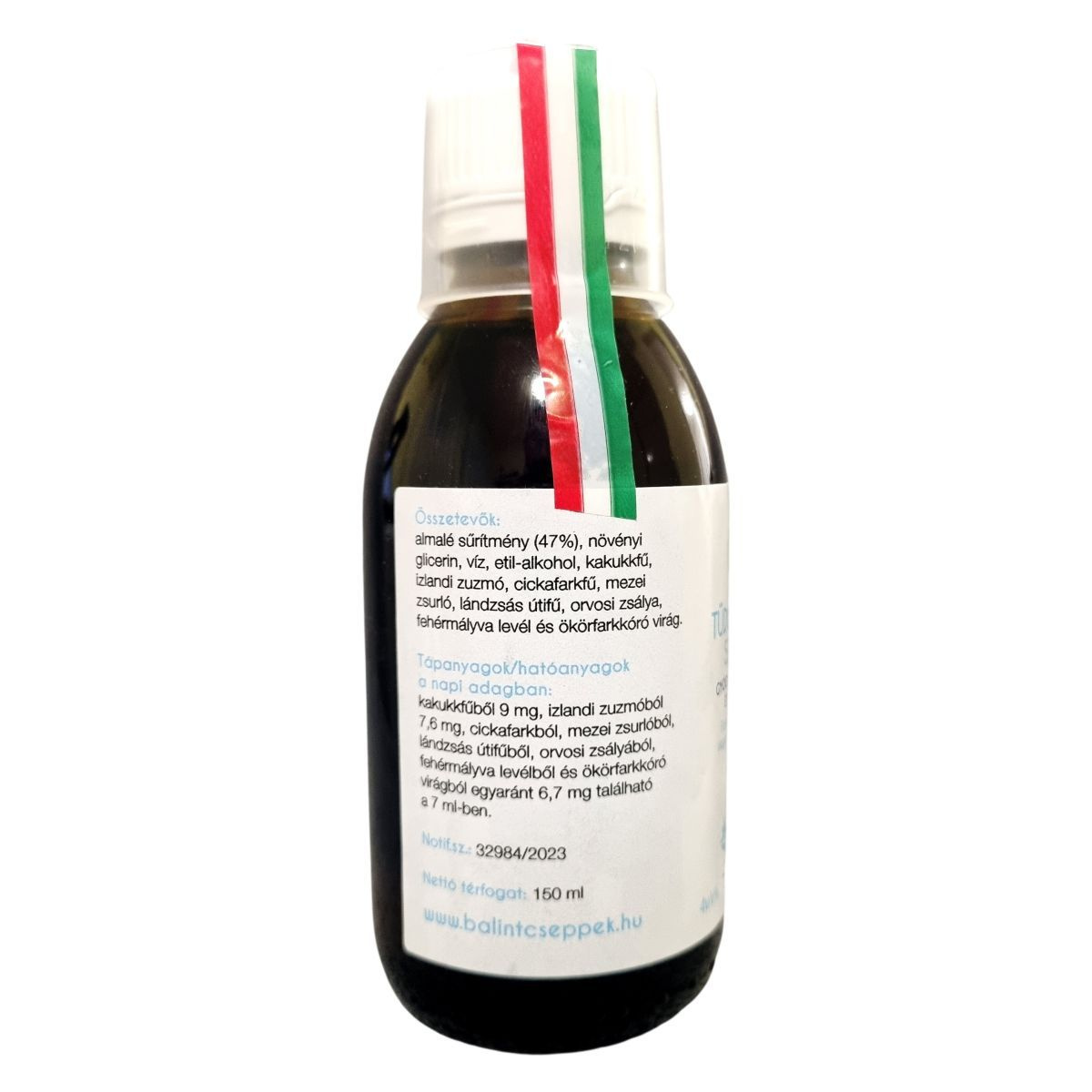 A BÁLINT Cseppek Tüdő-Füves szirup 4 térfogatszázalék alkoholt tartalmazó, növényi alapú folyékony étrend-kiegészítő készítmény, amely gyógynövényekhez, például kakukkfűhöz, izlandi zuzmóhoz, cickafarkfűhöz, mezei zsurlóhoz és másokhoz valamint 47%-os almalé sűrítményhez készül. A napi 7 ml-es adag gyógynövényenként kisebb mennyiségű hatóanyagot tartalmaz, amelyek hozzájárulhatnak a légutak egészségéhez. A termék szobahőmérsékleten, gyermekektől elzárva tárolandó. Nettó térfogata 150 ml, Magyarországon gyártották és forgalmazzák.