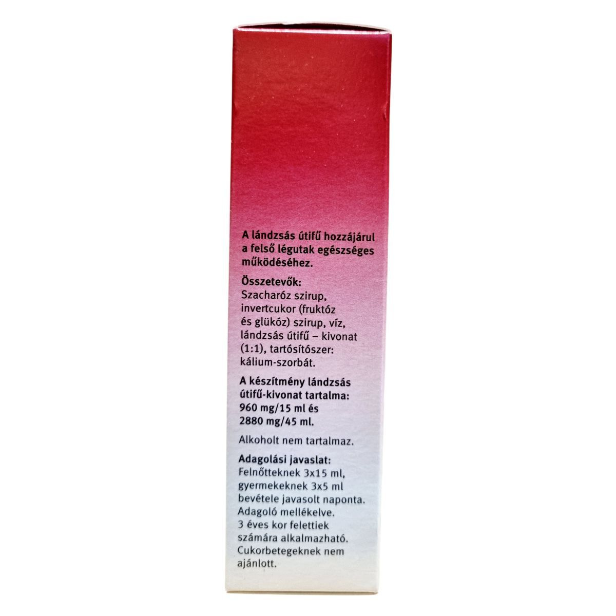 Szacharóz szirup, invertcukor (fruktóz és glükóz) szirup, víz, lándzsás útifű-kivonat (1:1), tartósítószer: kálium-szorbát.