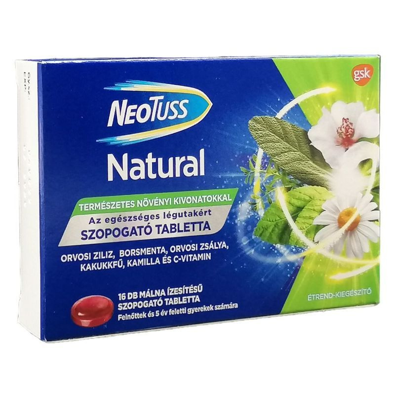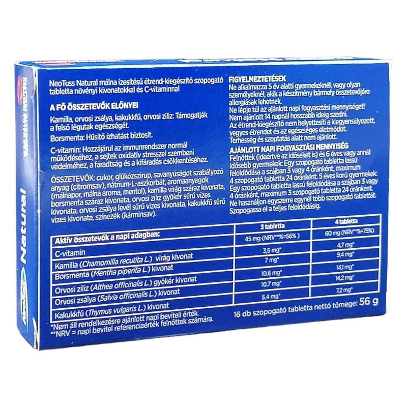 A NeoTuss Natural szopogató tablettában található C-vitamin hozzájárul az immunrendszer normál működéséhez, a sejtek oxidatív stresszel szembeni védelméhez, továbbá a fáradtság és a kifáradás csökkentéséhez.