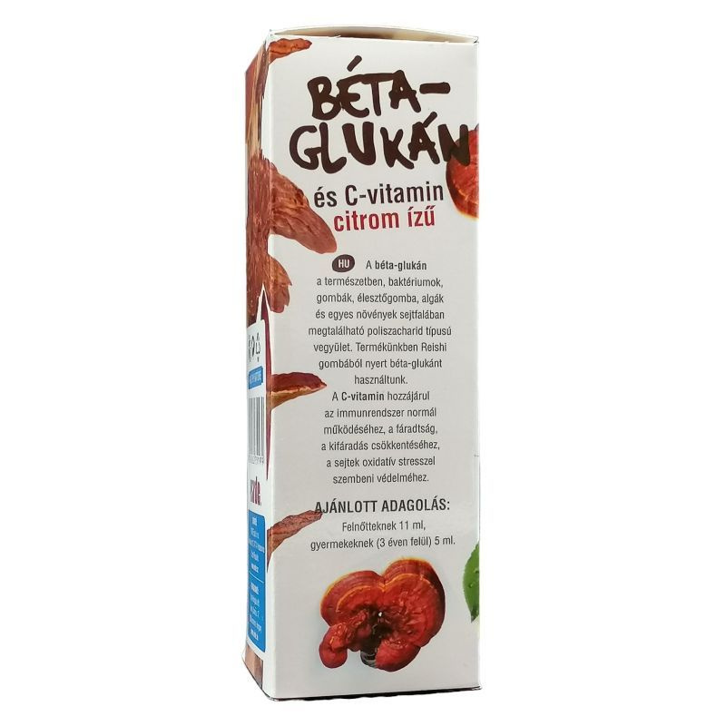Összetevők: 100 ml termékre vonatkoztatva: Víz, fruktóz, szorbit, Béta-1,3-D -glükán (2300 mg/100 ml, 230 mg/nap RDA:-%) aszkorbinsav (2005 mg/100 ml) (225 mg, azaz 250% RDA), természetes citrom aroma, metil-cellulóz, kálium-szorbát, nátrium-benzoát. Tápérték 100ml-ben: 100 ml szirup energia értéke 726 kJ (171 kcal) Fehérje <0,100 g Szénhidrát 42,7 g béta-1, 3 - D-glükán 2,7 g Zsír <0,010 g aszkorbinsavat - C-vitamin 2,0 g. Mikor ajánlott Béta glükán szirupot fogyasztani étrend kiegészítő céllal? Kimerültség, túlhajszoltság esetén, legyengült immunrendszerrel járó betegségek esetén, magas koleszterinszint és keringési elégtelenségek mellett, a bőr gombás fertőzései esetén az immunrendszer támogatására, hüvelygomba fertőzés esetén, allergiás, asztmás kórállapotokban, vagy krónikus felső légúti gyulladások esetén. Adagolás: felnőttek és 3 év feletti gyermekek: 0,15 ml testsúly-kg naponta. Megfázás, legyengült immunrendszer esetén a napi adag kétszeresére növelhető! Hogyan számoljam ki, hogy a testsúlyomnak megfelelően naponta hány ml szirup fogyasztása ajánlott? Testsúly x 0,15= napi adag (ml). Példa: 77 kg-os felnőtt esetén: 77 x 0,15=11,55 ml, 10 kg-os gyermek esetén:10x0,15=1,5 ml. Adagolásra vonatkozó figyelmeztetés: a készítmény fogyasztása 6 hónapos kor alatt nem ajánlott! Figyelmeztetés: a béta glukan szirup fogyasztása kizárólag étrend kiegészítő céllal javasolt. Alkalmazása nem alkalmas betegségek önálló kezelésére, betegségek megelőzésére vagy gyógyítására! Használat előtt a szirupot alaposan fel kell rázni. Az ajánlott napi adagot ne lépje túl! A termék fogyasztása nem helyettesíti a vegyes táplálkozást és a változatos étrendet! Felbontás után egy hónapig használható fel! A termék gyermekek elől gondosan elzárandó! Sötét hűvös helyen tárolandó!
