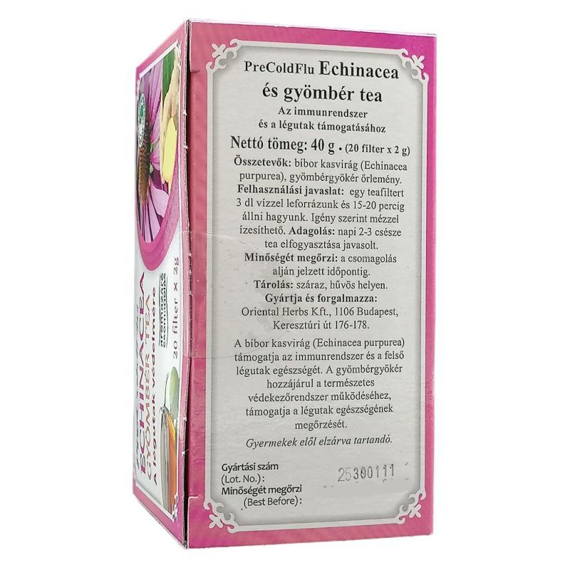 PreColdFlu Echinacea és gyömbér tea, amely természetes összetevőkkel segíti a megfázás tüneteinek enyhítését.