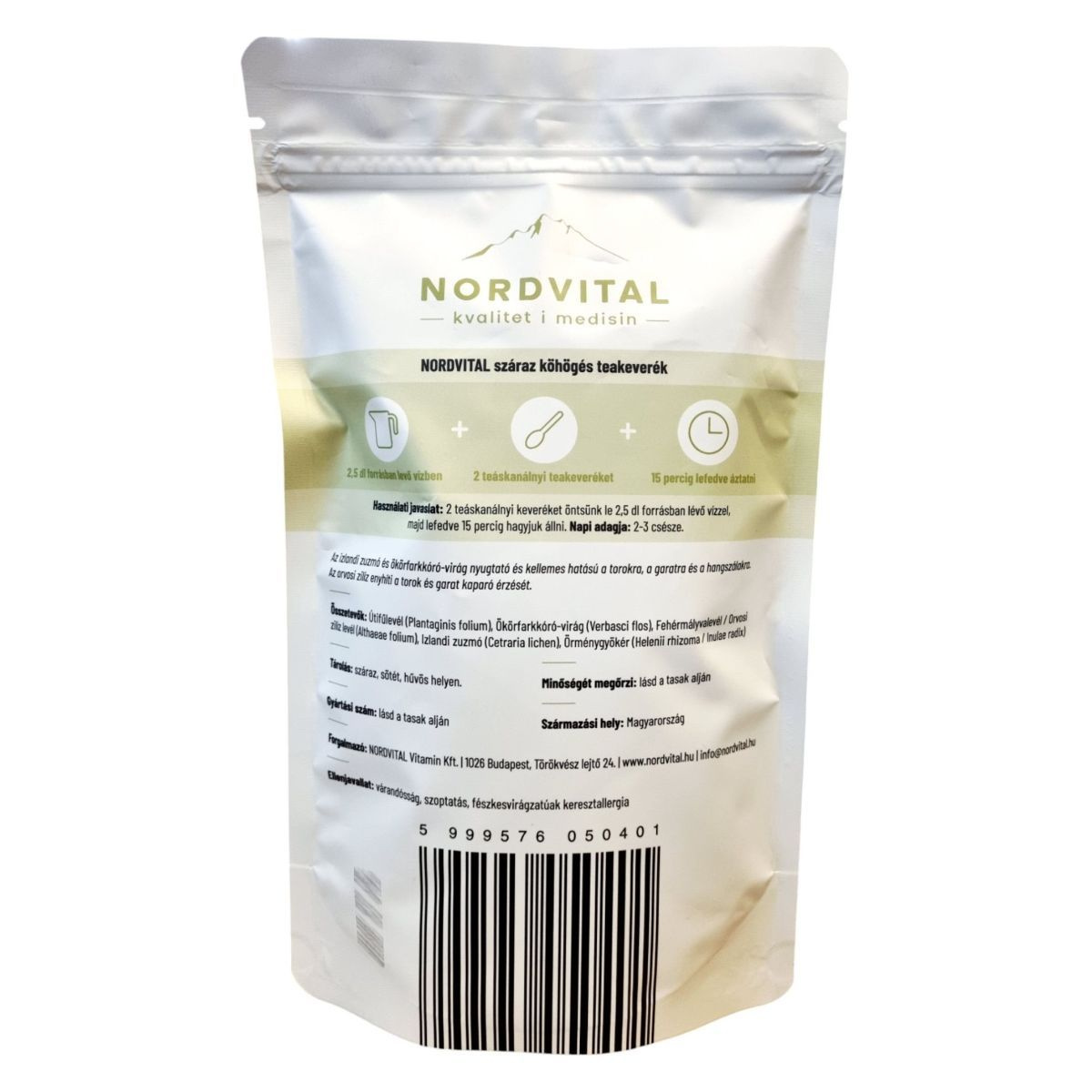 A NORDVITAL Nyugodt tüdő száraz köhögés teakeverék 100% natúr gyógynövényekből készülhet, és kellemes hatású lehet a torokra, a garatra és a hangszálakra. Az izlandi zuzmó és ökörfarkkóró-virág nyugtató hatású lehet, míg az orvosi zilíz enyhítheti a torok kaparó érzését. A termék Magyarországon készül, és a forgalmazója a NORDVITAL Vitamin Kft. Tárolása száraz, sötét, hűvös helyen ajánlott. A termék használata ellenjavallt várandósság, szoptatás alatt, valamint fészkesvirágzatúak keresztallergia esetén.