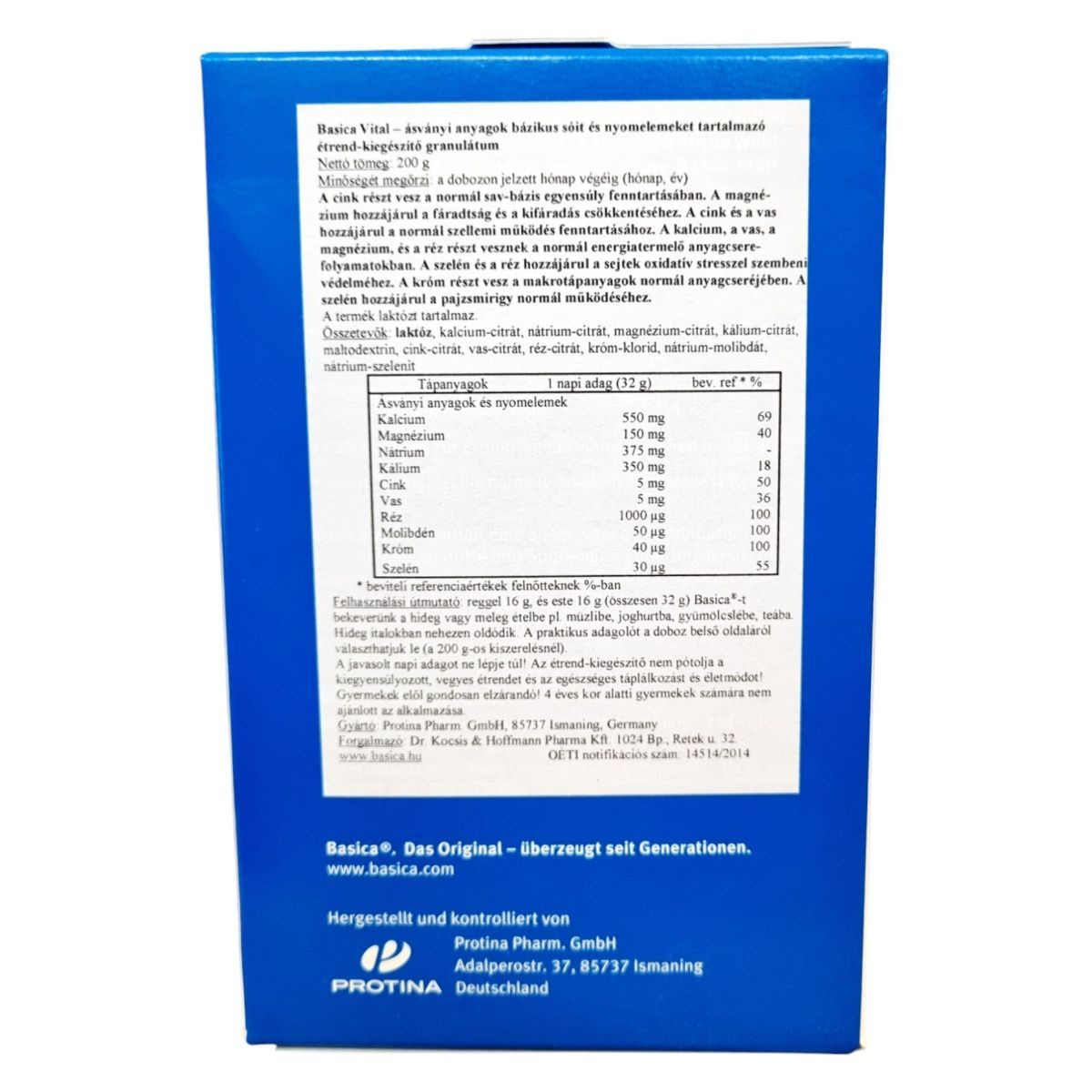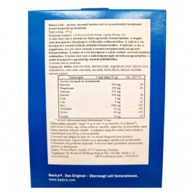 A Basica Vital egy bázikus ásványi anyagokat és nyomelemeket tartalmazó étrend-kiegészítő granulátum, amelyet hideg vagy meleg ételekbe keverve lehet fogyasztani. A termék cinket, magnéziumot, kalciumot, vasat, rezet, krómot, molibdént és szelént tartalmaz, amelyek hozzájárulhatnak a normál sav-bázis egyensúly fenntartásához, a fáradtság csökkentéséhez, a normál szellemi működés fenntartásához, valamint a sejtek oxidatív stresszel szembeni védelméhez. A termék gluténmentes, de laktózt tartalmaz, és nem tartalmaz aromákat, édesítőszereket vagy jódot. A praktikus adagoló a doboz belső oldaláról választható le. A termék gyártója a Protina Pharm. GmbH, forgalmazója a Dr. Kocsis & Hoffmann Pharma Kft.
